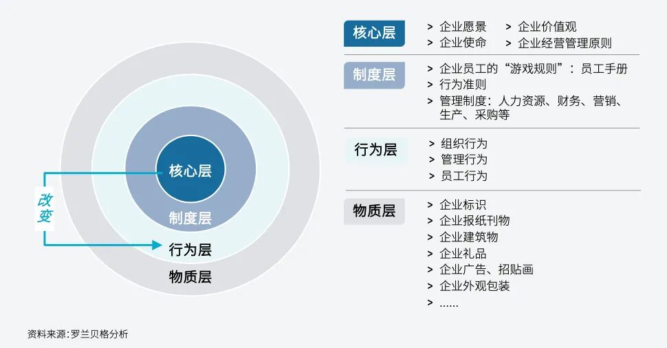 罗兰贝格分析显示:企业文化共有四个圈层——包含愿景价值观等的核心层、与管理制度行为准则等相关的制度层、包含组织行为等的行为层、以及由企业刊物礼品等组成的物质层。