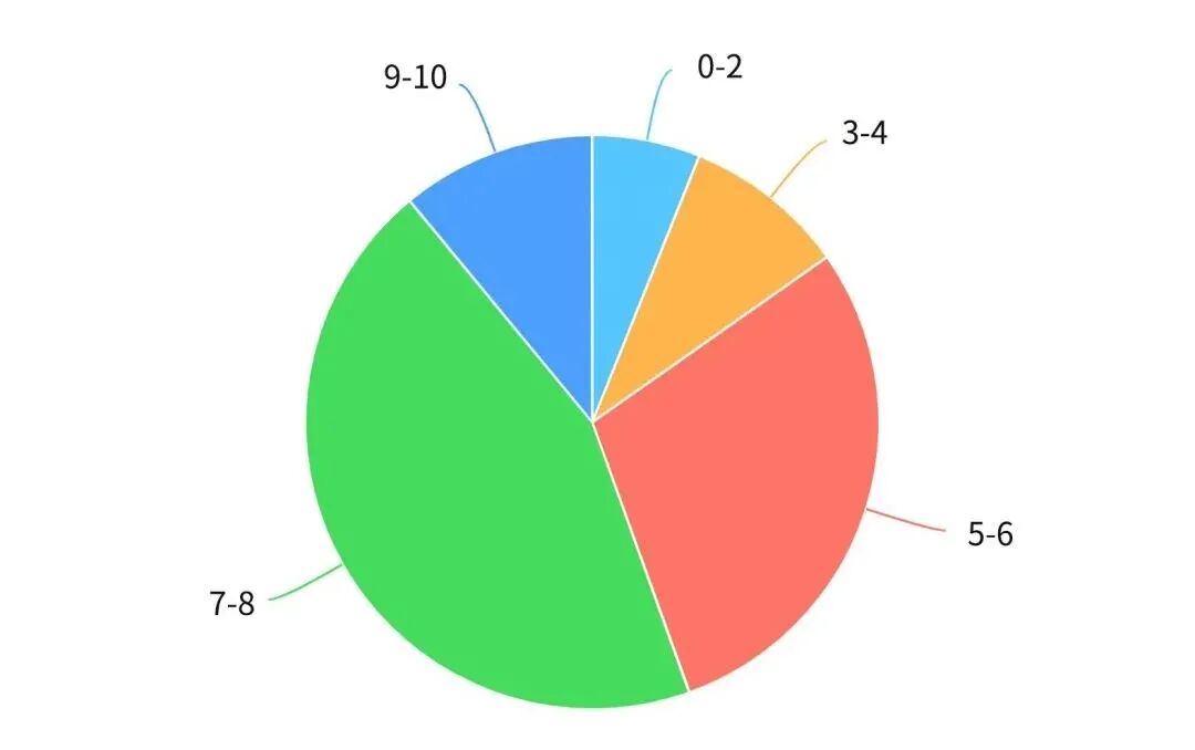 调研的最后一项,是为自己的工作体验打分。绝大多数人表示满意度在及格线以上,其中打7-8分(满分10分)的人最多。