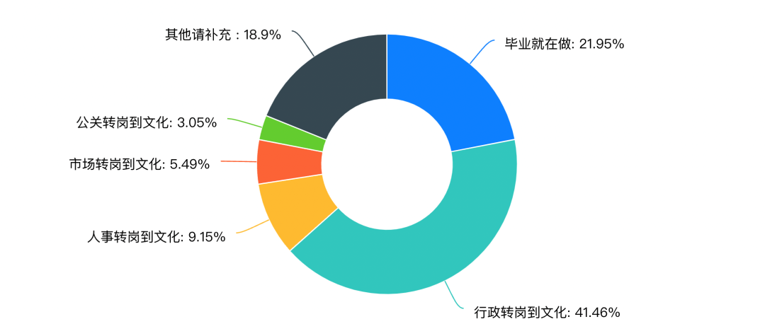 其中一半以上的人表示自己是从行政转岗企业文化的,另外还有20%的人表示是毕业就在做。