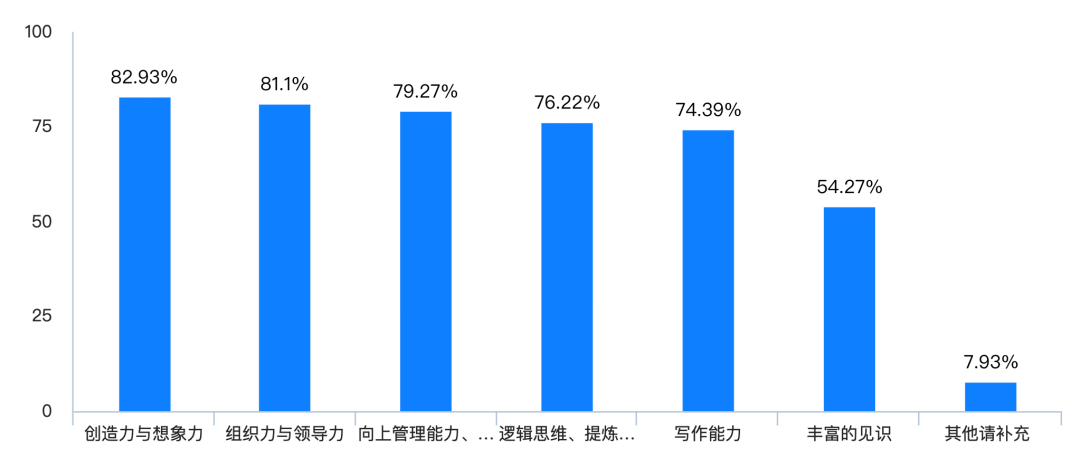 组织力与领导力、向上管理与沟通能力、逻辑思维&提炼重点的能力大家同样也认为是很重要的,尤其表现在对文化的理解和应用场景上。