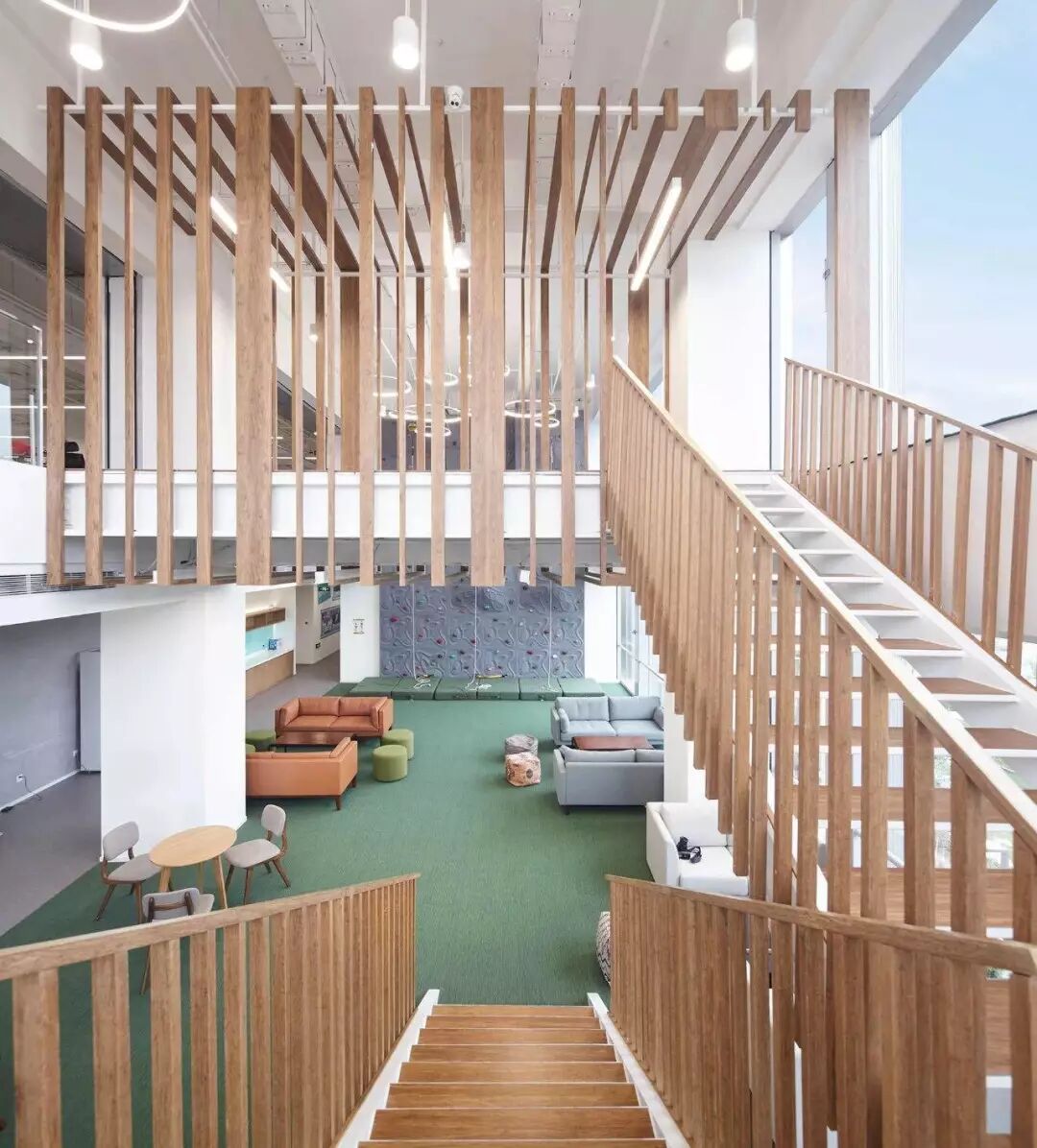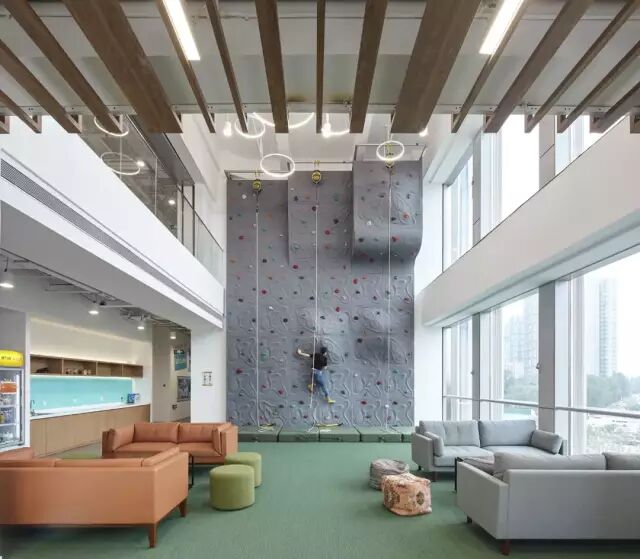 绿篱奇迹岛,是以自然、健康运动与挑战自我为主题的公共空间,给员工、客户休憩、娱乐使用。有趣的格栅厢、充满挑战的攀岩墙、自然柔和的瑜伽室、活动丰富的健身房,满足不同员工的健康生活需求,展现新氧人不惧挑战,运动健康的生活方式。