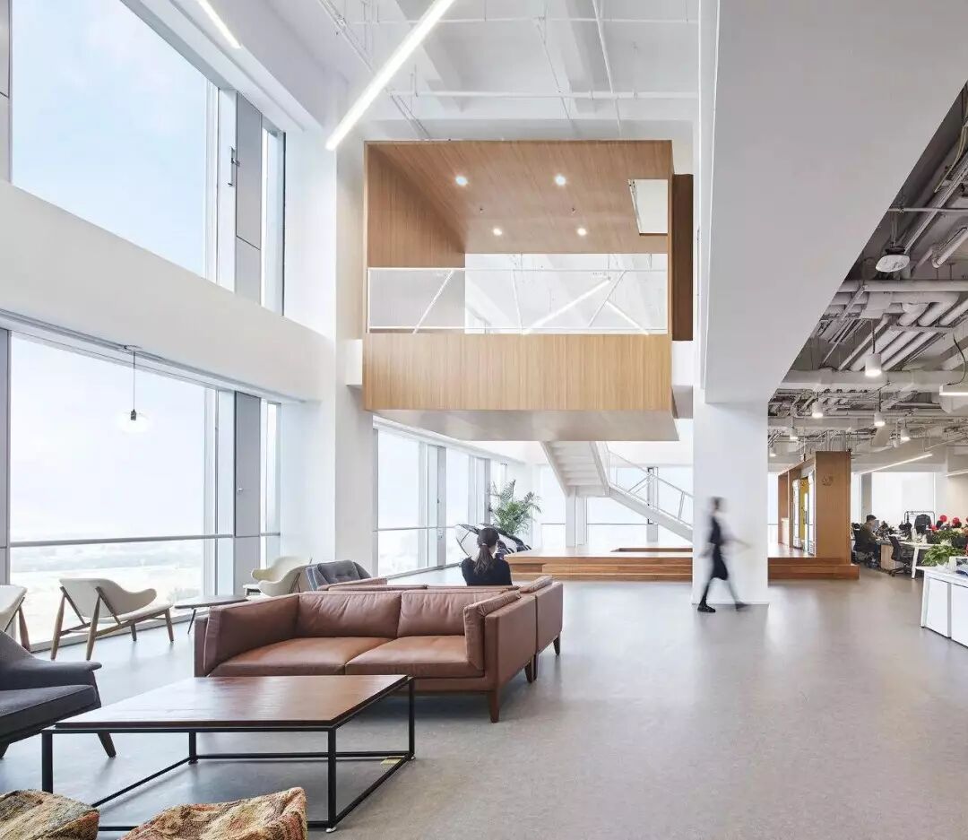 新氧的新办公楼位于北京市朝阳区融新科技中心 E 栋,一共有 12 层,利用大厅入口挑高二层的开放空间和建筑每两层贯穿的垂直空间,创新设计了「一厅五岛」的办公格局,极大提高了空间利用率。