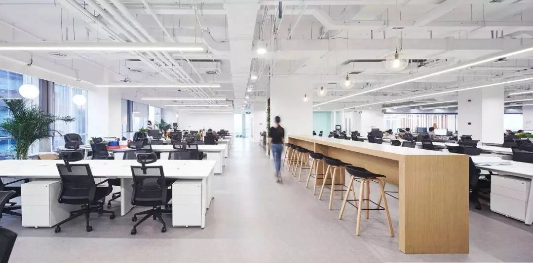 在开放式办公区域,用长条吧台桌做区域划分,员工可以在这里讨论办公、午间用餐等。