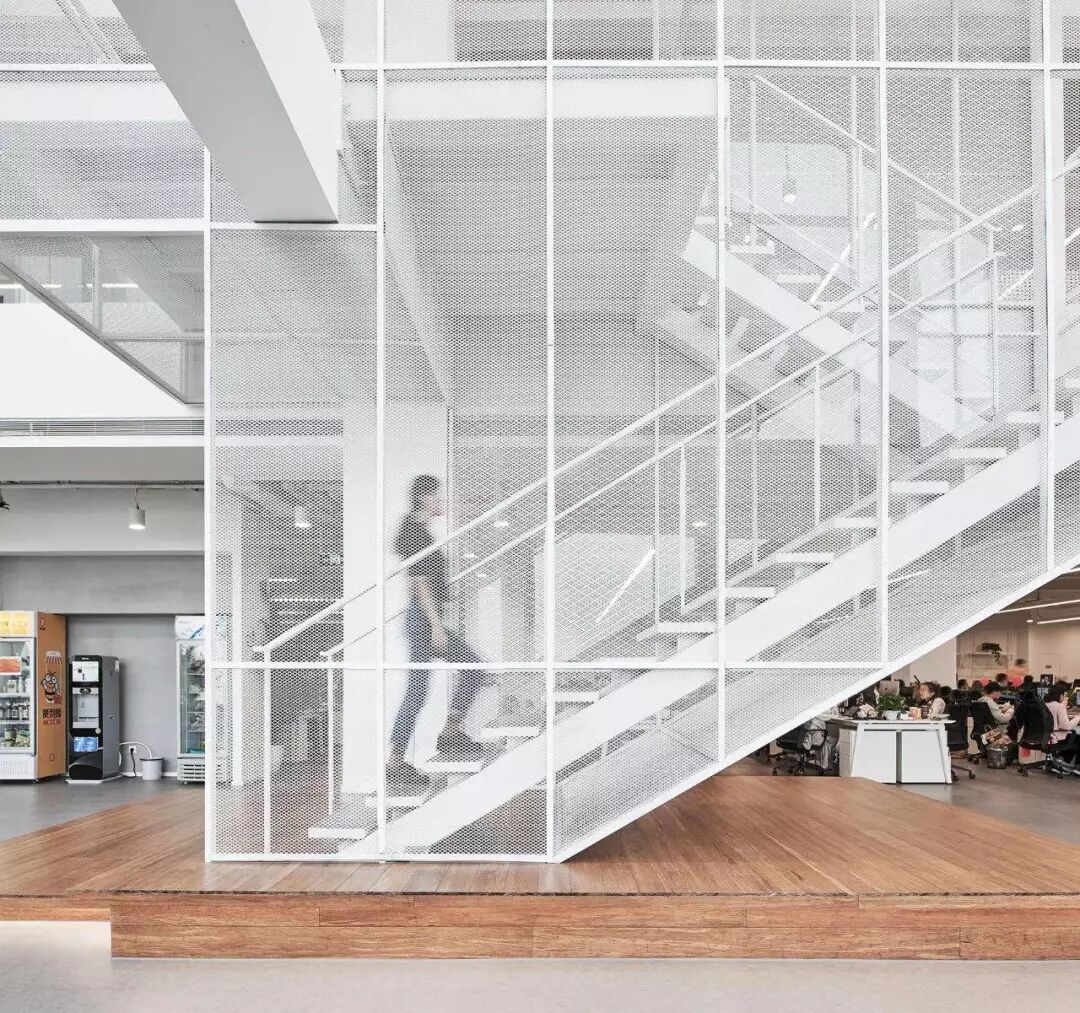 游廊艺谷岛是一个用钢网包裹构筑出的楼梯空间,更像是一个雕塑艺术品,在视觉上分隔了空间却没有割裂,更加了空间流动感。