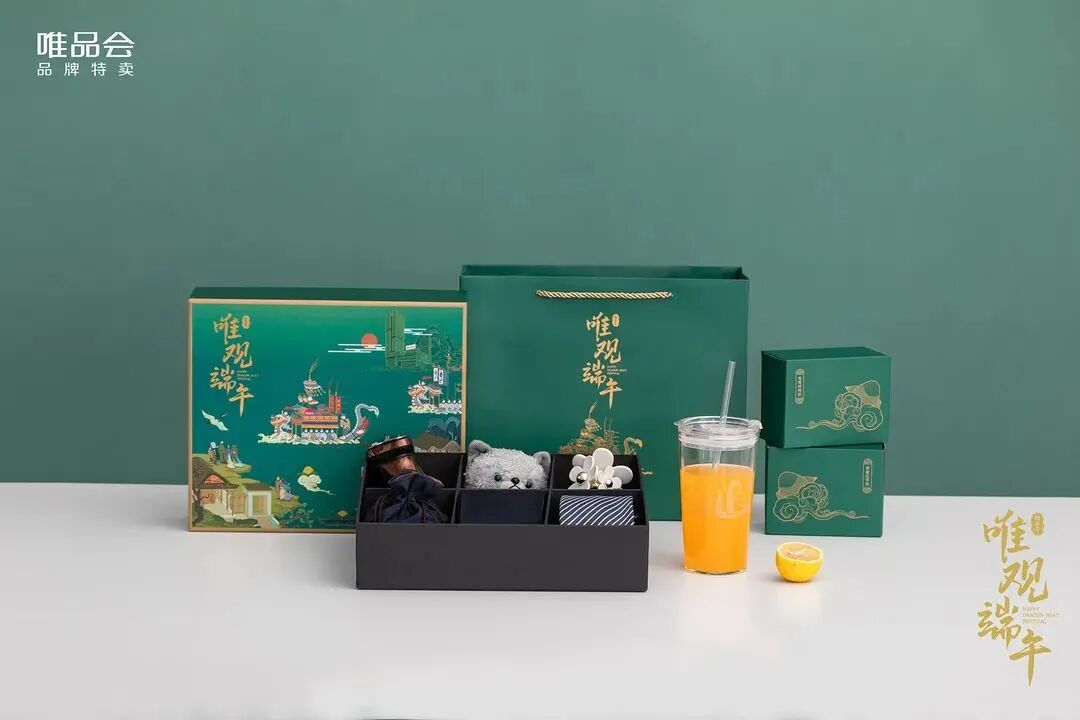 唯品会以故宫博物馆清代《雍正十二月行乐图·五月竞舟》为蓝本,与品牌色调、logo及总部大楼相结合,打造出「唯观端午」国潮风礼盒。