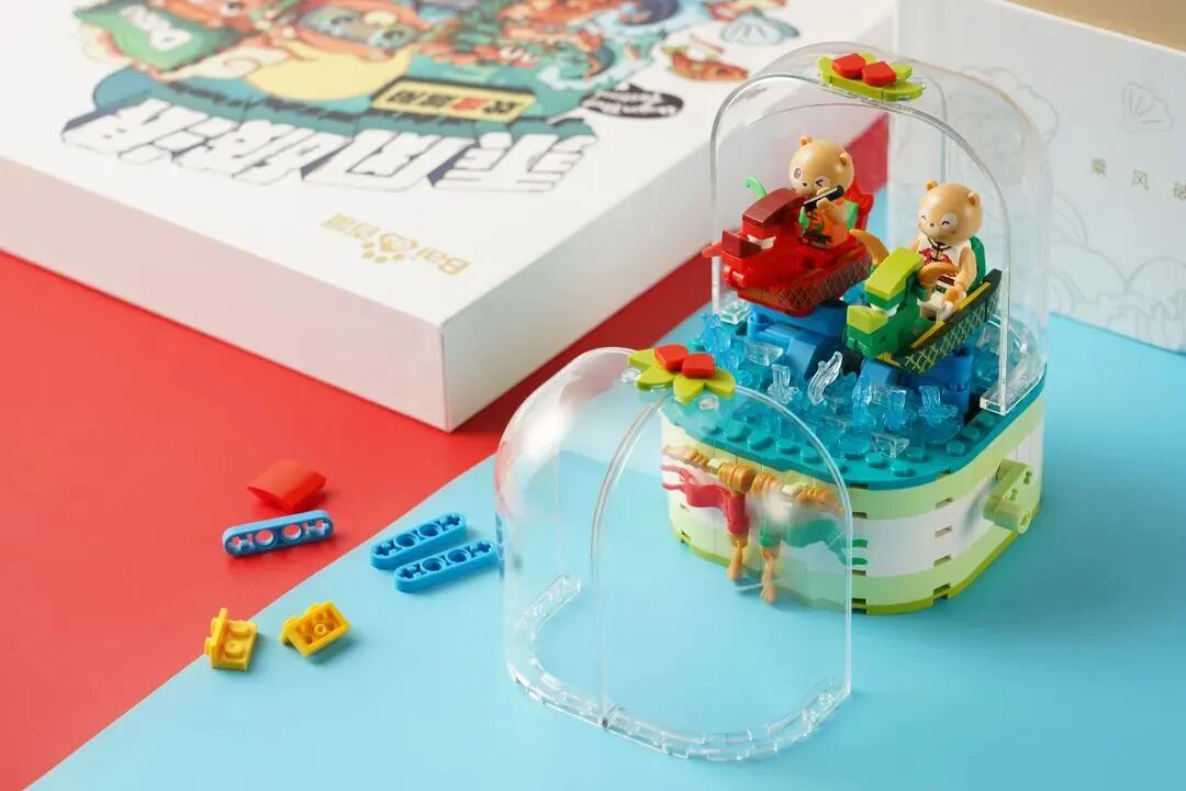 去年百度的端午节礼盒中就配有「定制龙舟积木」,可动可静,摇动右侧旋转把手后两只度熊就能开启竞速模式。还很贴心的配了防尘保护罩,收纳更方便哦~