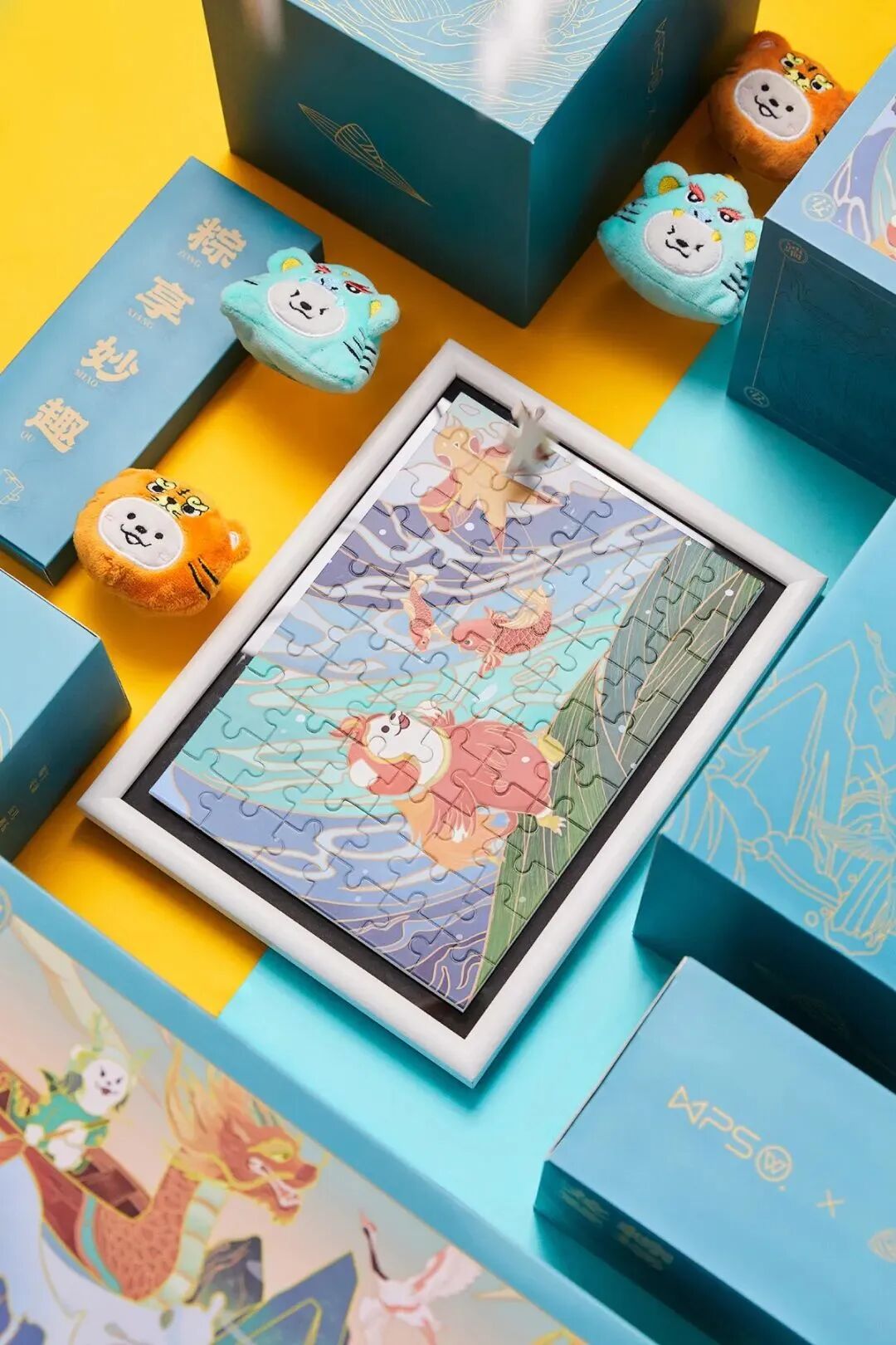 玩吧端午礼袋中有六个小盒子,可以拼成一幅完整的小玩与飞龙游戏图,展示着端午传统习俗。