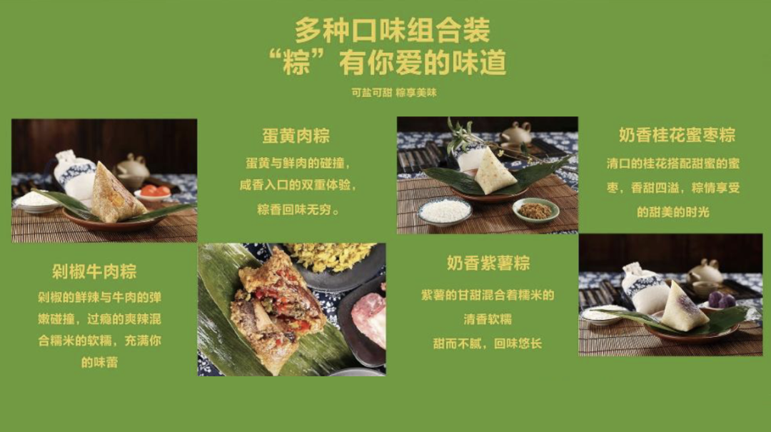 比如也肆集推出的「可盐可甜 粽享美味」组合装:剁椒牛肉粽、蛋黄肉粽、奶香紫薯粽、奶香桂花蜜枣粽。