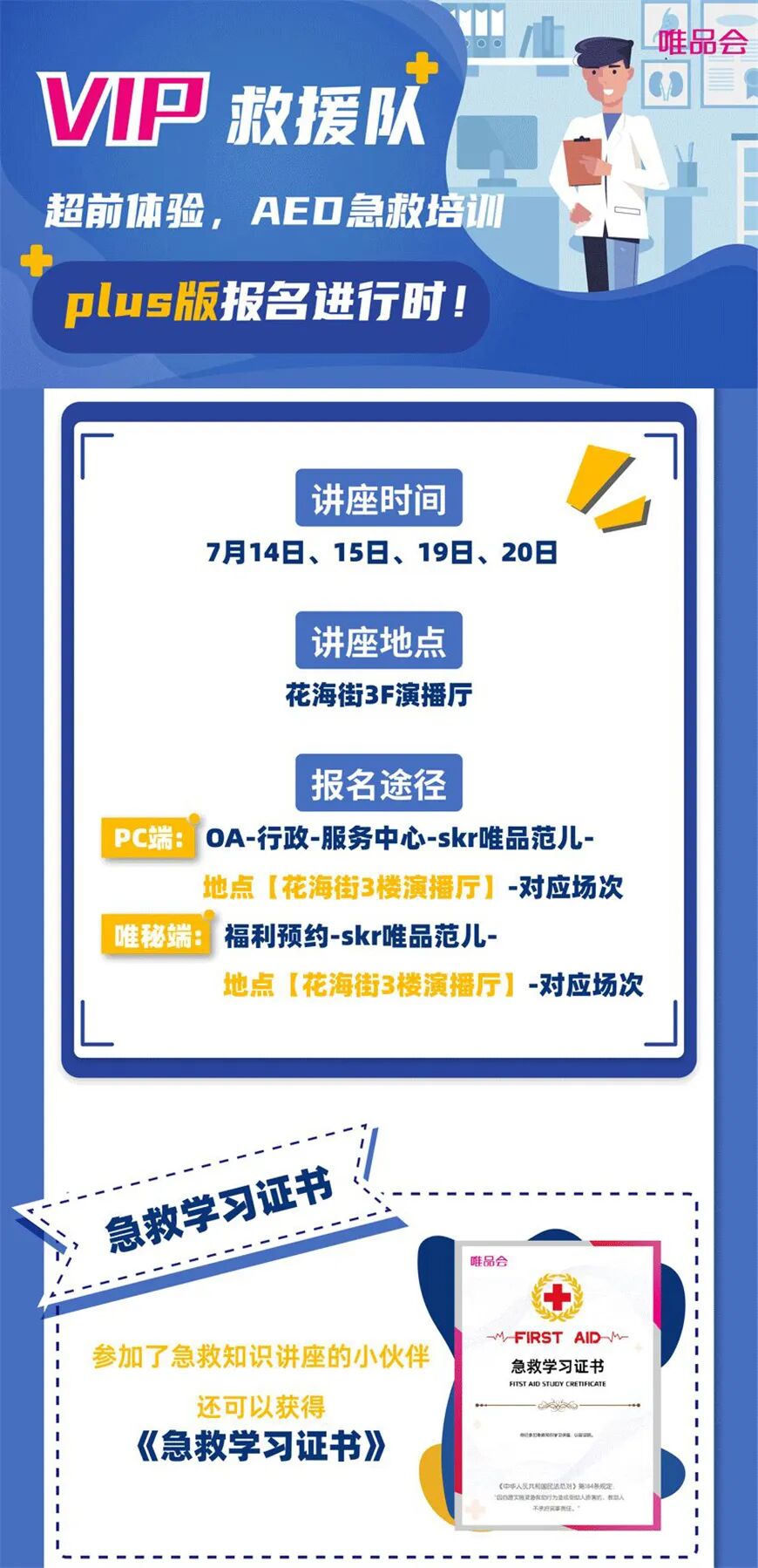 唯品会还会定期举办AED急救讲座,并颁发急救学习证书,表现优异的学员还可加入“VIP急救队”,希望能让更多的小伙伴掌握急救知识。
