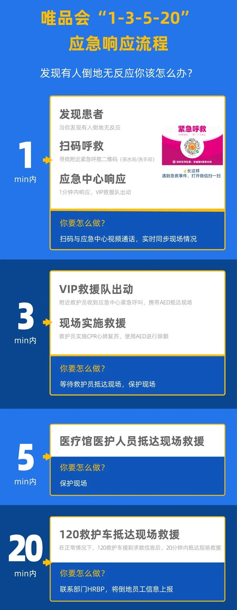 唯品会建立了整套“1-3-5-20”应急响应流程,明确了从发现突发情况到救护车抵达前,每分钟该做什么。