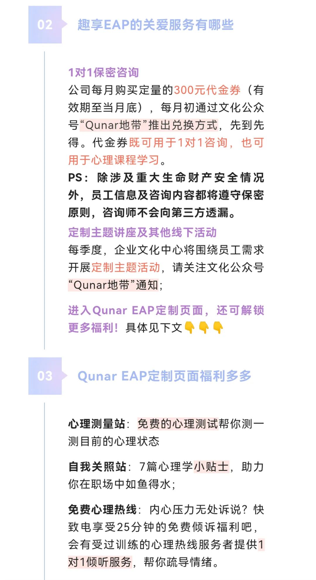 去哪儿2016年建立趣享EAP,现在与简单心理合作为员工提供帮扶计划,通过1对1咨询、心理课程和讲座等,帮助解决员工及其家庭成员的各种心理和行为问题。