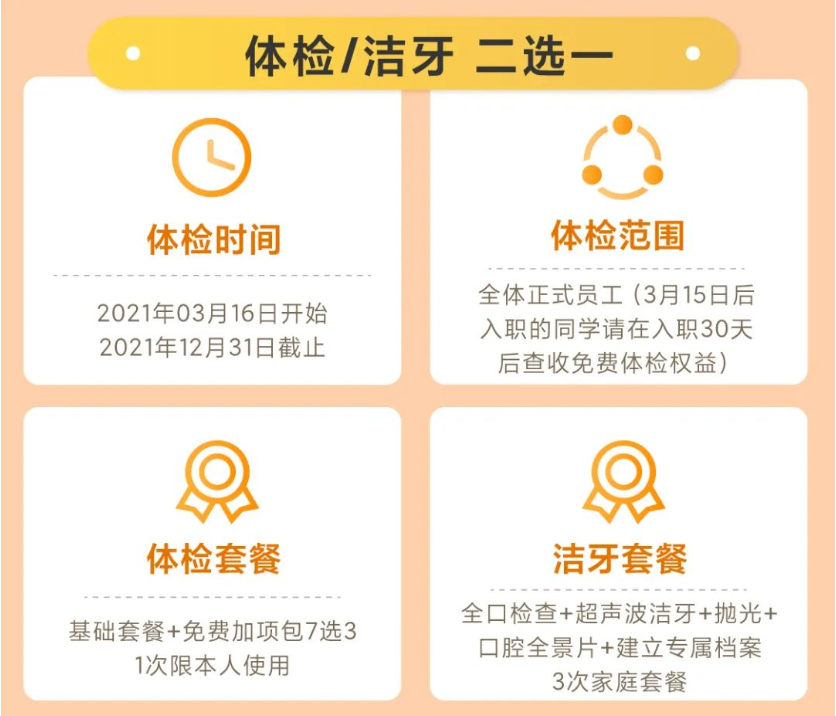 一般健康福利都以体检为主,但随着员工需求的变化,可以选择“自选体检”的方式,增加牙科、眼科等多种项目,帮员工消除多方面的健康隐患。