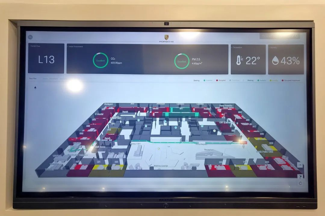 保时捷中国的总部在设计之初非常注重“健康宜居”,设有智能照明系统和空气质量管理系统,绿植总面积更是达到了300多平方米,并在每层设有环境实时监控,可以实时监测当前环境的温度、湿度,以及空气中二氧化碳和PM2.5的含量,保证空间的各项指标都在最优区间。