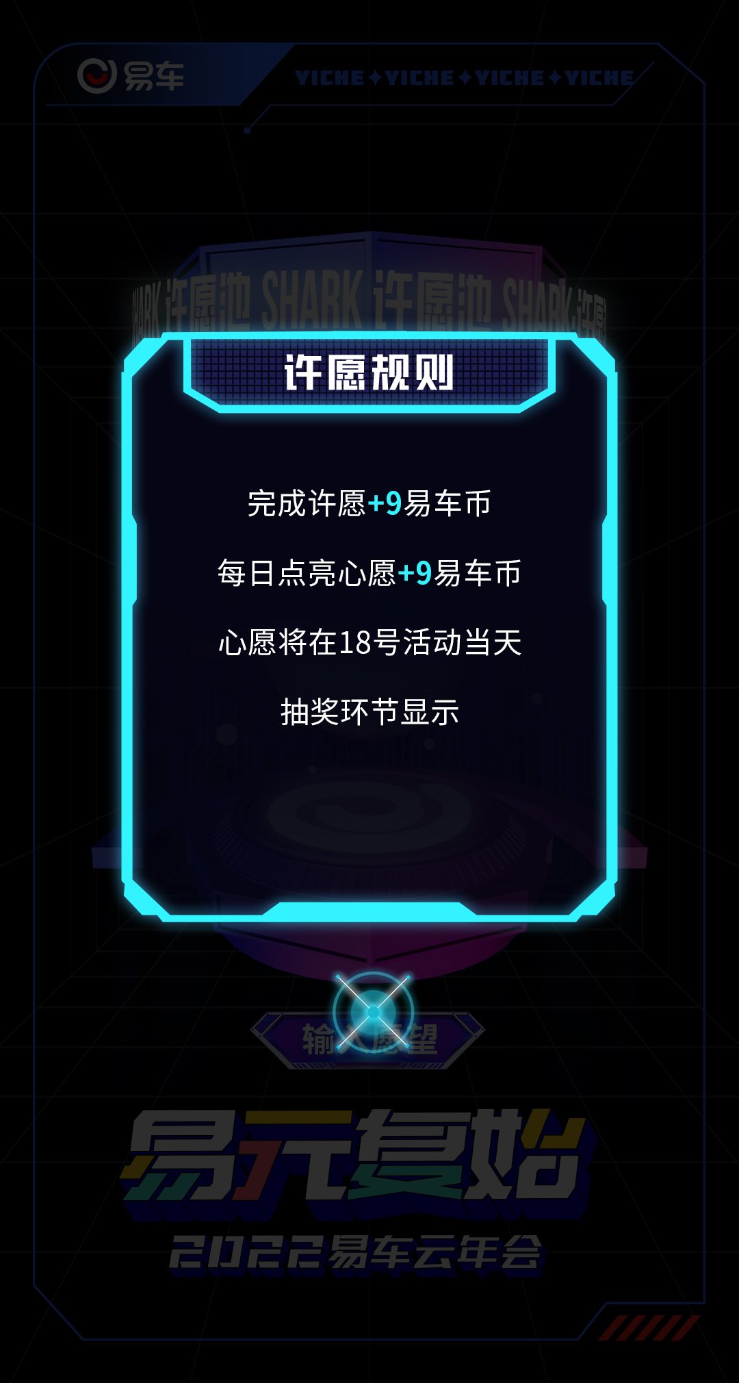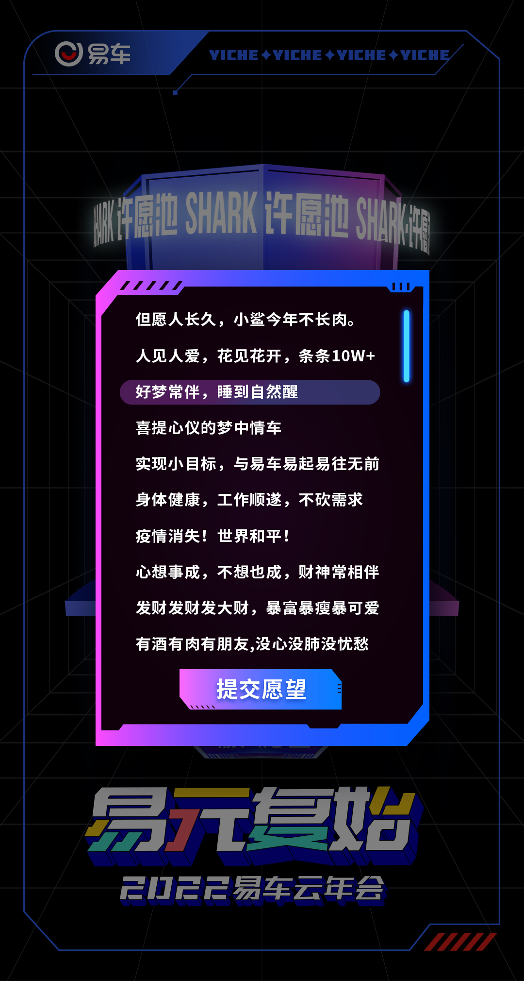 年会当然还少不了许愿环节了,易车的云端年会更是将许愿玩出了新花样:线上许愿还可以点亮心愿,并在活动当天显示出来,谁不想当那个幸运儿呢~