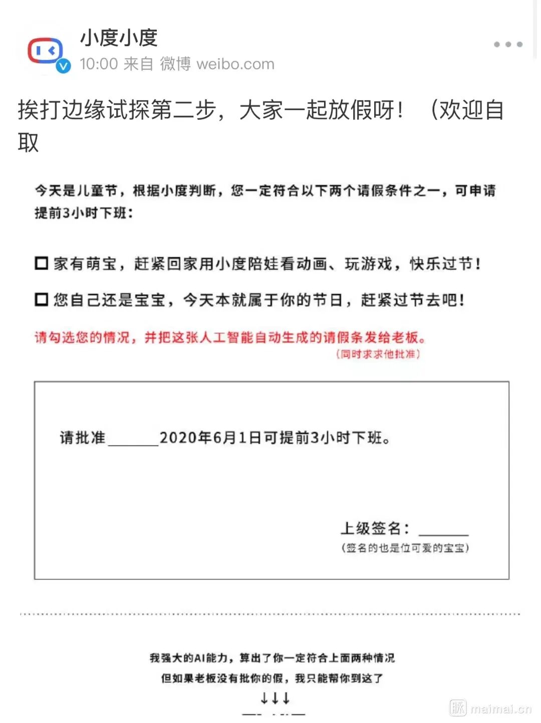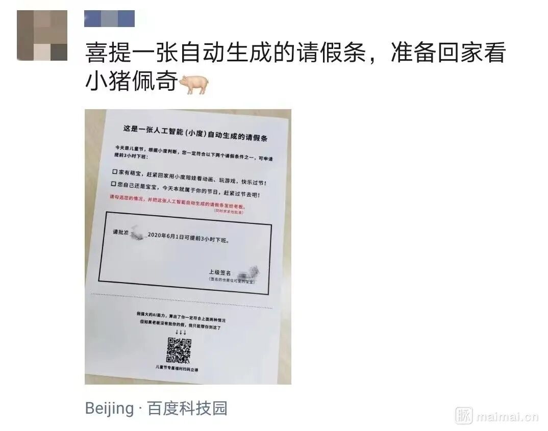 比如20年的时候小度员工的工位上都收到了一张小度自动生成的请假条,简直开心到变形!