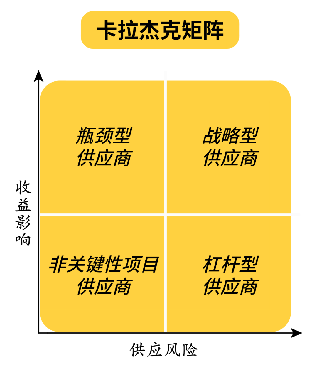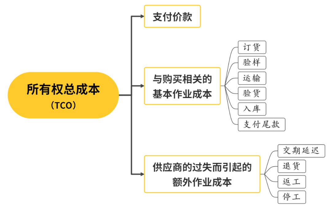 企业采购管理包括时间管理、质量管理、成本管理三个方面。在时间和质量得以保证的前提下,采购决策只按照采购物品或服务的价格(狭义的采购成本)来选择供应商。TCO 可以应用于任何形式的采购,包括生产物资采购(如固定资产)、经营物资采购(如办公设备)、备品备件(MRP)的采购、原材料采购和服务采购等。采购项目的原因和结果、投入和产出、努力和回报之间存在无法解释的不平衡性,所以要保障基准线是一个80/20关系,即在任何一组事物中,最重要的只占其中一小部分约20%,其余次要的占多数约80%。卡拉杰克矩阵是一种行之有效的供应商分析矩阵模型。它能帮助采购人员保障最大化安全供应、降低采购成本,从而扩大采购谈判力度;通过策略化调整,帮助企业完成事务性采购到战略采购的转型。矩阵以采购两个重要方面为坐标维度:收益影响(采购项目在产品增值、原材料总成本比及产品收益等方面的战略影响)、供应风险(供应市场的复杂性、技术创新及原材料更替的步伐、市场进入的门槛、物流成本及复杂性、以及供给垄断或短缺等市场条件),将供应商分为四类:战略供应商、瓶颈供应商、杠杆供应商和非关键性项目供应商。巴雷托分析法又称ABC物料分类法,是采购和物料管理中常用的分类方法。其基本原理就是区分主次、分类管理,其目的在于采购或储存适量的物料,避免缺料停产及因积货导致的资金周转困难、增加持有管理成本等。ABC物料分类法将管理对象分为ABC三类,这三类物料的特点如下:◎ A类物料:重要物料,价值高、品种少,种类占总物料种类的10%左右,而采购金额占总物料采购金额的70%左右,应当重点采购管理控制。