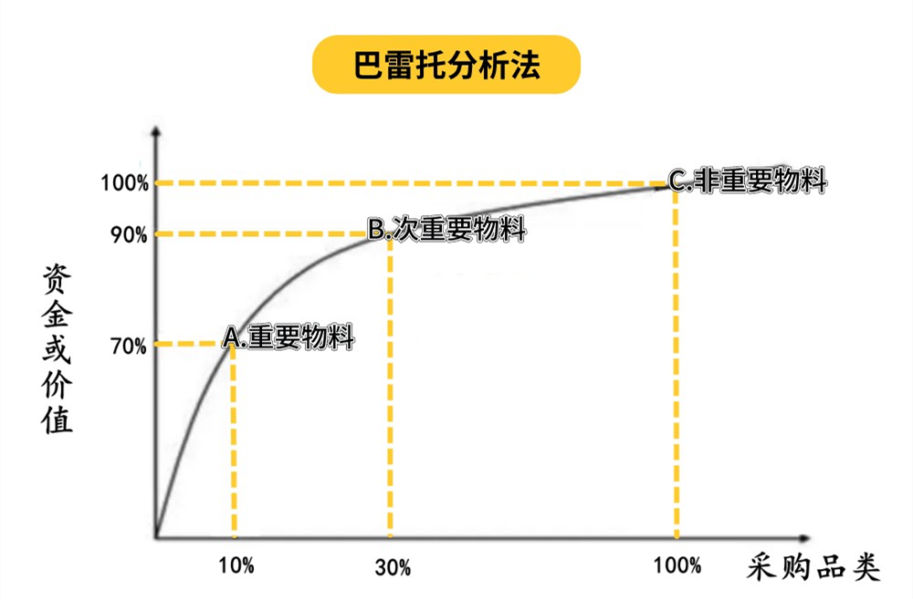 ◎ B类物料:次重要物料,价值较高、品种较少,种类占总物料种类的20%左右,而采购金额占总物料采购金额的20%左右,应当适度重点采购管理控制。
