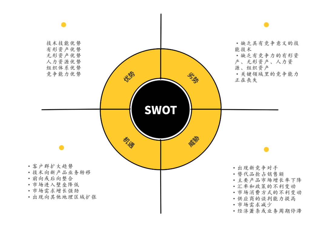 算头总结了20+个管理工具,今天先来个上篇,赶快转发收藏,文末还有免费高清大图资料包可以拿!一定要看到最后!SWOT分析法即态势分析法,适用于从企业内部和外部条件对各方面资讯进行综合与概括,分析市场环境与竞争对手,进而分析组织的优劣势、面临的机会和威胁,从而制定企业战略,将公司战略与公司内部资源、外部环境有机结合起来。