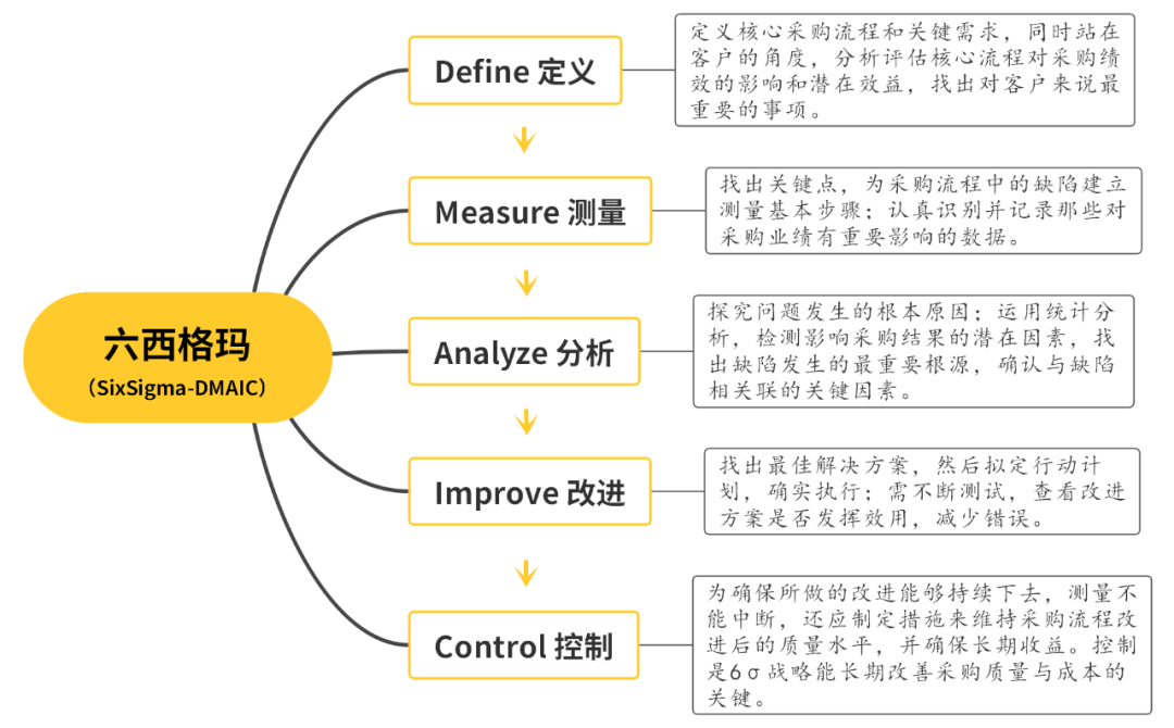 在制定采购工作目标或者采购项目目标时,考虑一下目标与计划有没有SMART化。只有具备SMART化的计划才具有良好的可实施性,也才能保证计划得以实现。同时也为采购管理者提供了对采购人员的绩效考核考核目标和考核标准,使考核更加科学化、规范化,更能保证考核的公平公正。全面质量管理--TQM(Total Quality Management),是一个以质量管理为核心,以企业全员参与为基础,通过让顾客满意和企业管理者及员工、供方、合作方等相关方受益的质量体系,能够有效改善企业采购效率、提升质量管理。六西格玛管理是一种能够严格、集中和高效地改善企业采购质量流程管理的技术,带动质量成本的大幅度降低,最终实现降本增效与企业竞争力的突破。DMAIC模型是六西格玛的一套操作方法,指定义、测量、分析、改进和控制,能够用于优化和维护采购流程与设计的改进循环。如下图,采购管理基于DMAIC的实施步骤,根据采购流程各个阶段的特点进行详细分析,并做改进实施。所有权总成本-TCO,是一种以“价格”为导向的采购成本管理观念。