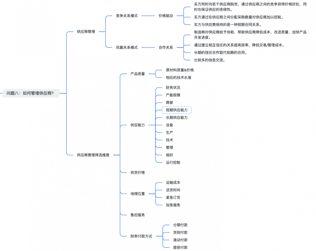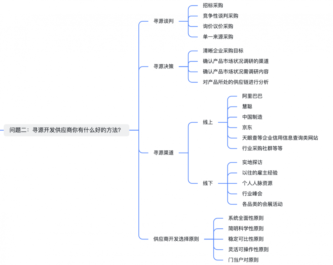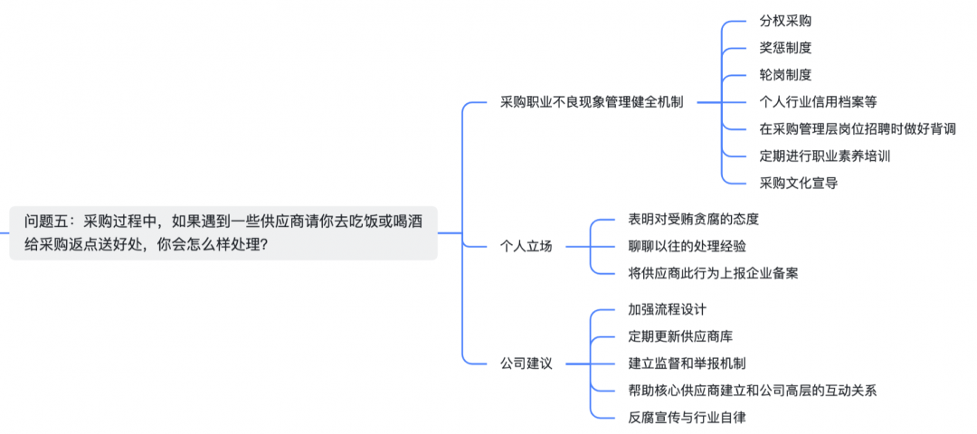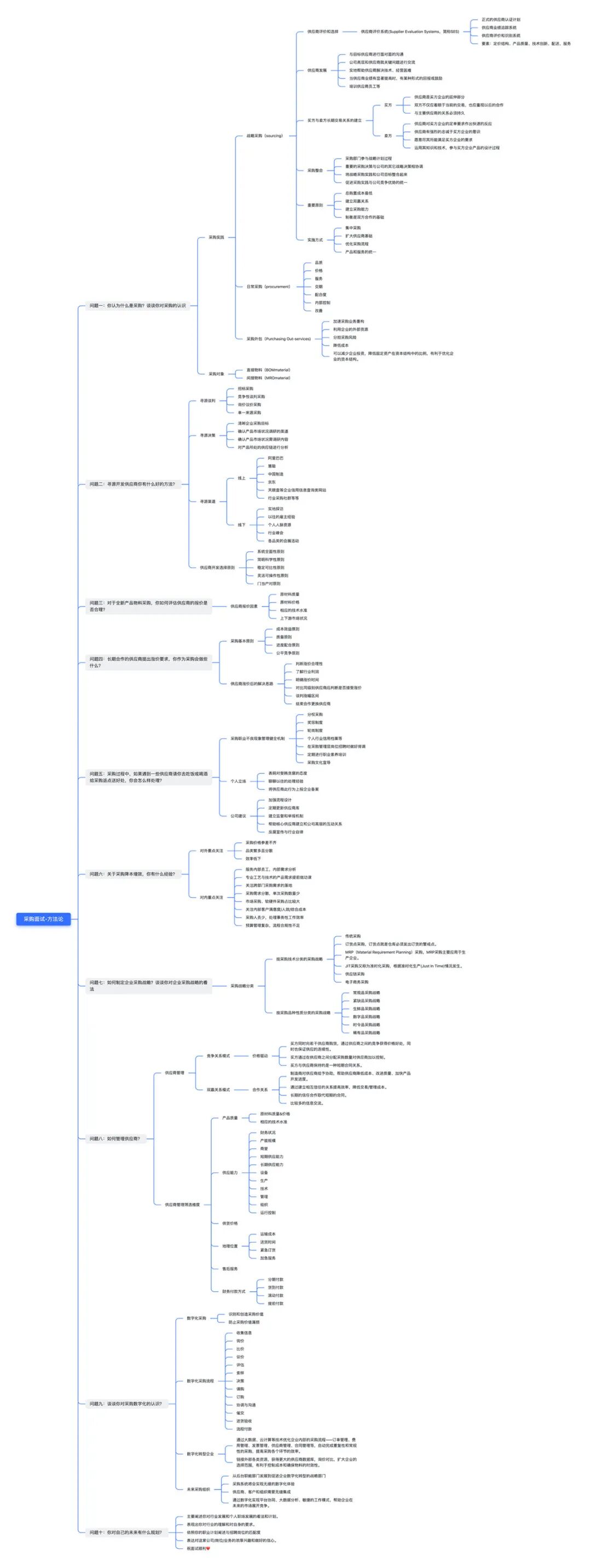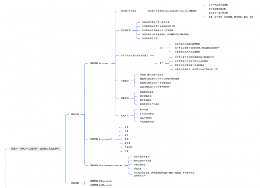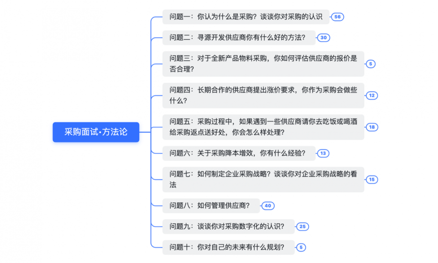 为了让绝大多数采购面试者与企业招聘采购人才的雇主们将关注点聚焦到采购专业本身,我们梳理了10个高频面试采购岗位可能面临的专业问题与回答关键词节点逻辑脑图。