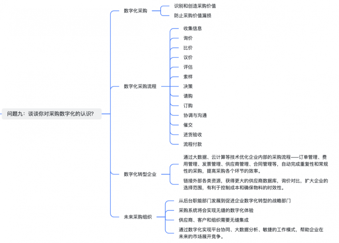 面试者对采购数字化应该是开放的心态与拥抱的,毕竟这是大势所趋。如果是面试中小企业,遇到采购数字化的问题,大家也可以谈谈中小企业的采购数字化痛点和雷区,在面试官前树立起专业形象。