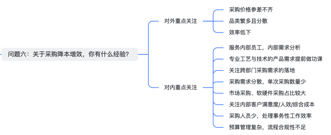 直接采购与间接采购的降本增效也是完全不同的路子,面试官如果对降本增效的话题感兴趣,可以详细聊一聊直接采购与间接采购的降本增效方法。