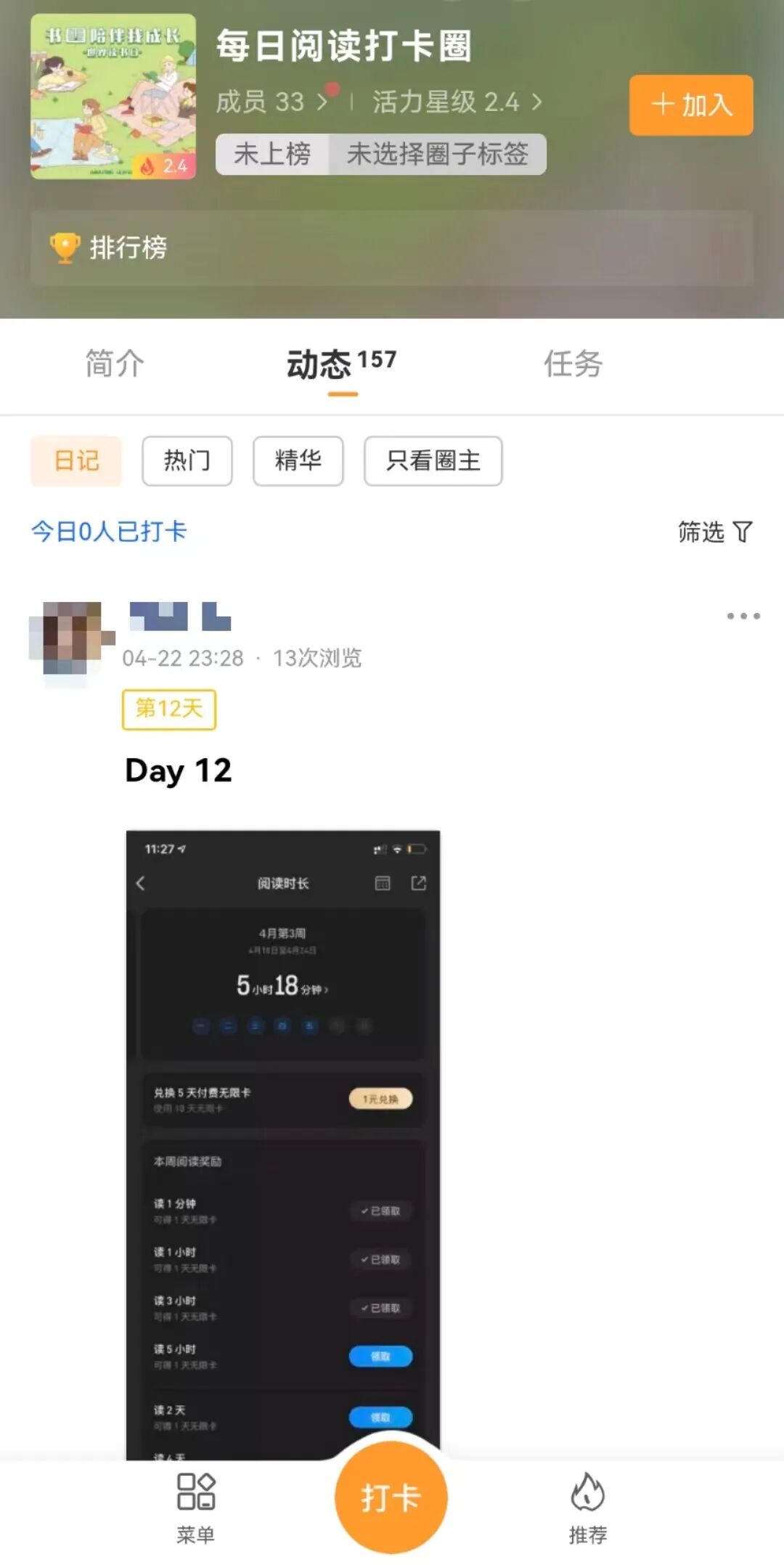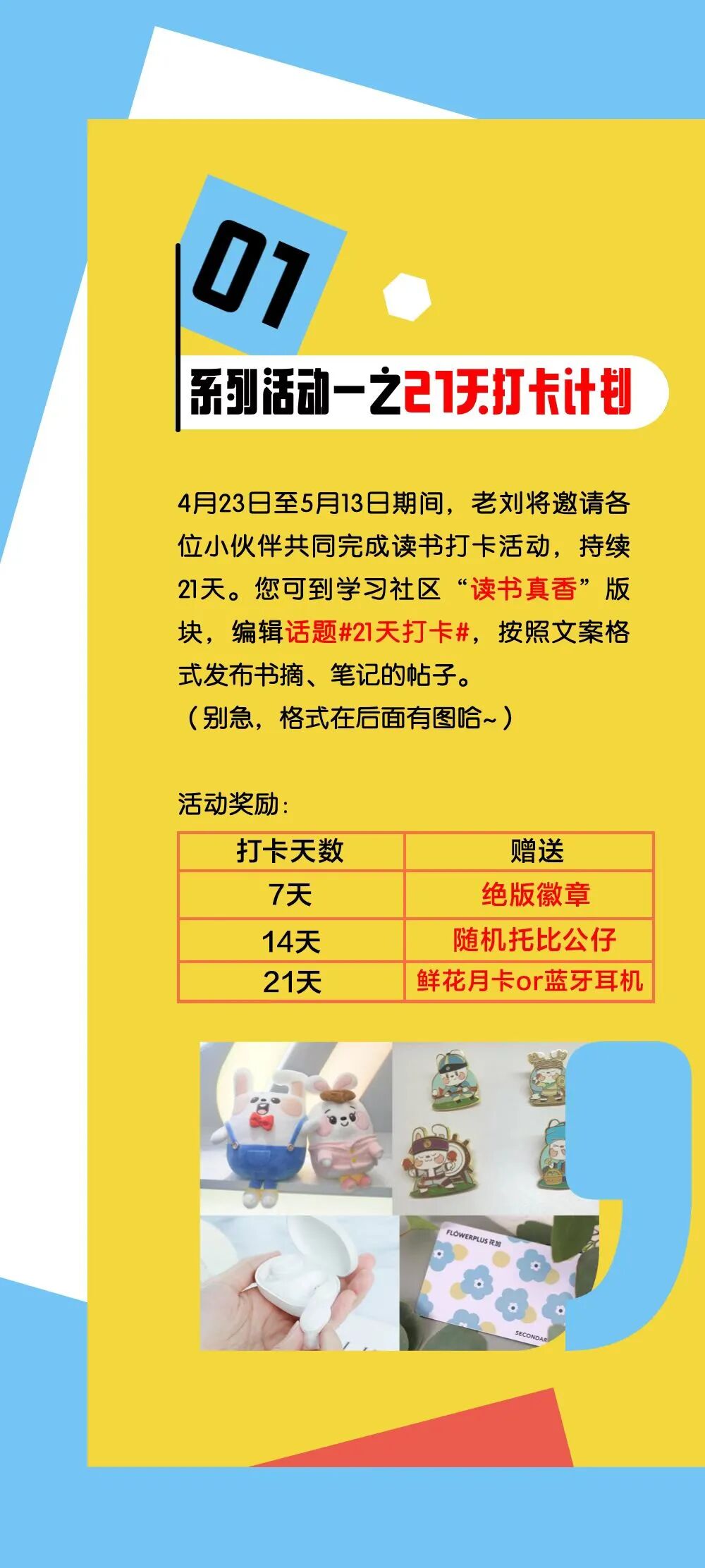 一起教育在去年读书日推出「21天读书打卡活动」,在学习社区「读书真香」板块编辑话题#21天打卡#,按照文案格式发布书摘、笔记的帖子。