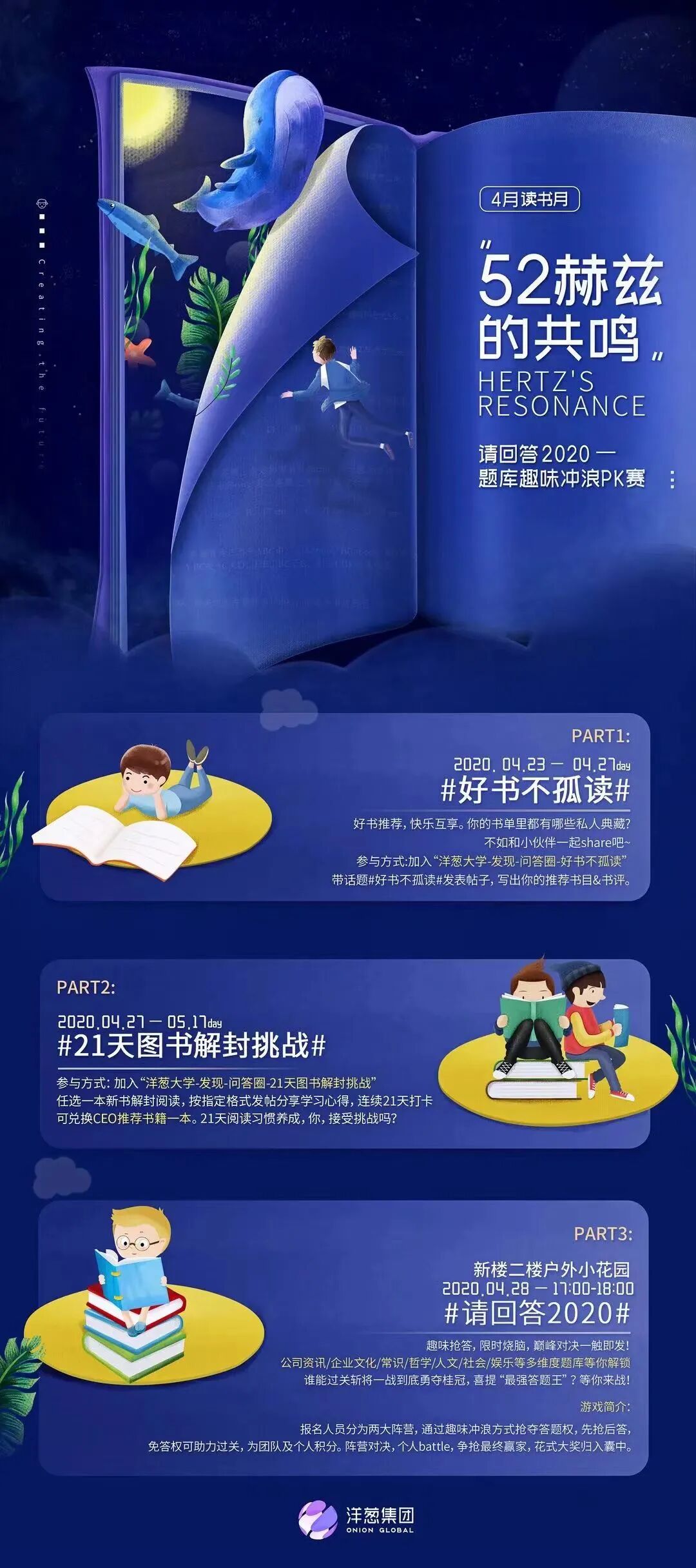 洋葱集团2020年在读书月发布「52赫兹的共鸣」主题读书海报,共有三部分:好书不孤单、21天图书解封挑战、请回答2020。