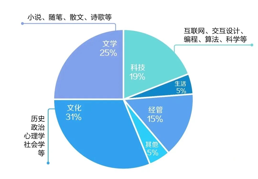 *内部问卷显示,30%的ByteDancer每周会花五小时以上的时间看书,而每周至少读一小时书的同学超过总问卷人数的83.6%。最感兴趣的书籍类型中,第一名是文化类,紧跟其后的是文学类,第三名是科技类。