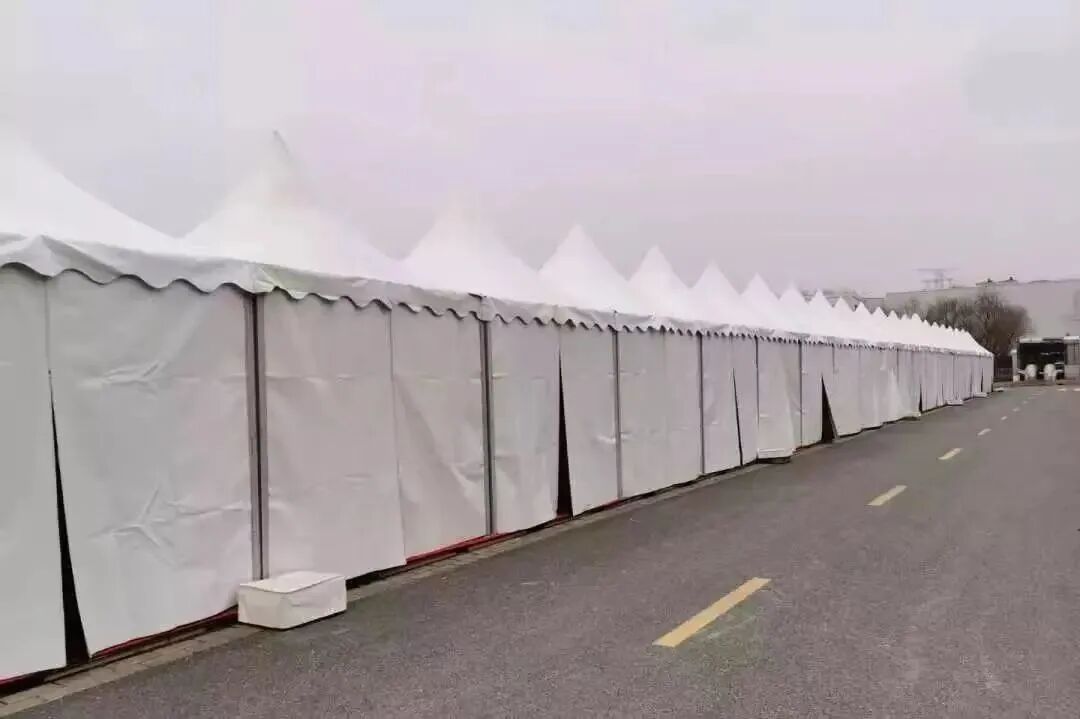 *上汽集团厂区里的一长排白色帐篷,用于访客接待;