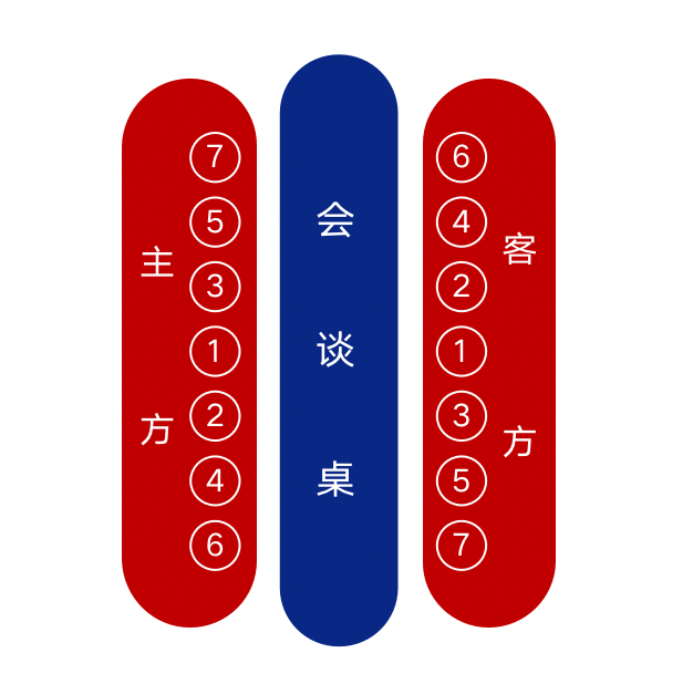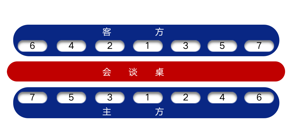 通常在商务会见和座谈时会采用「长条桌」和「会谈桌」两种形式,具体座位安排见下图⬇️