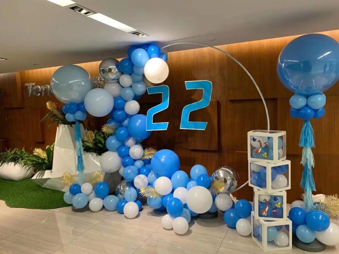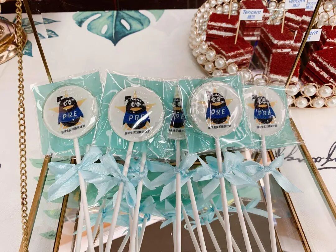 不如像腾讯这样,不仅做了主题气球装饰、把点心摆放成跟主题相关的样式,还把企鹅形象做成棒棒糖发给大家,企业特色点满~