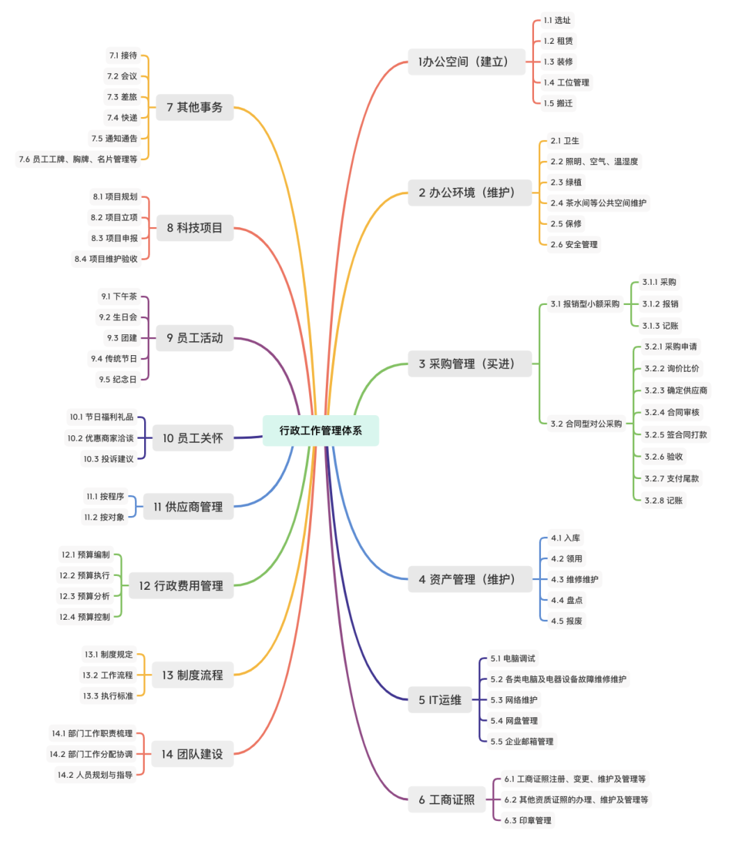 复盘归纳行政工作,有助于从局部事务中跳出来用全盘的角度看待行政岗位,优化流程。首先你可以梳理现在的工作体系,进行拆解细分归类。大概就变成了这样: