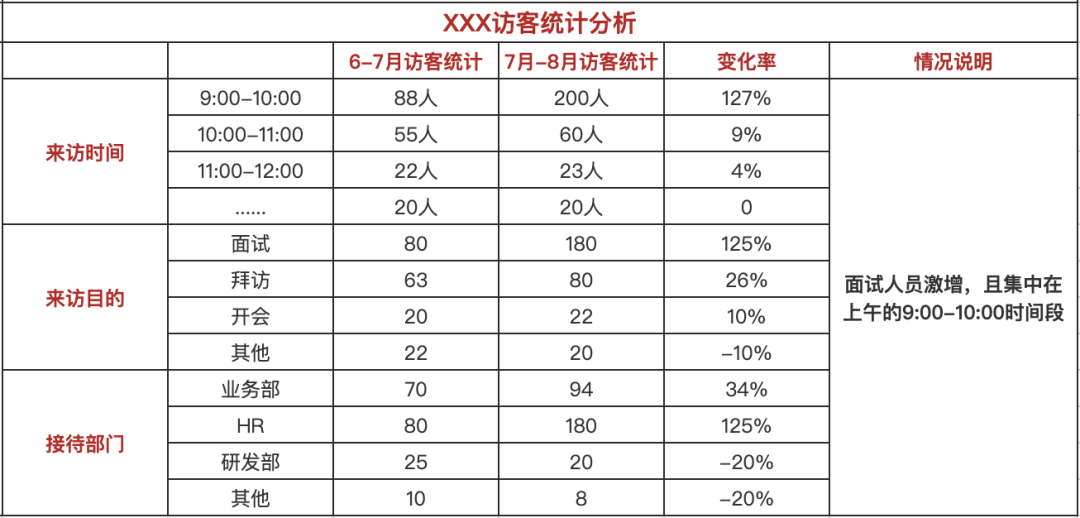 以访客管理为例,设定统计维度分别是每月、每天、各个时段的访客量、接待部门、目的等,统计分析方式如下: