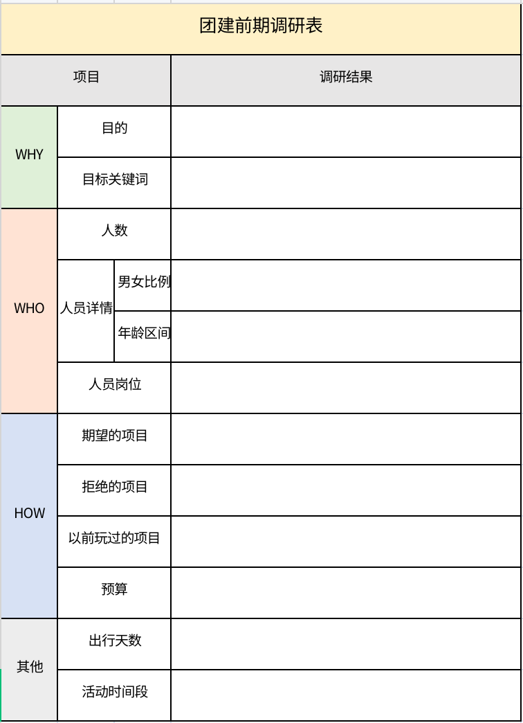 很多行政er觉得策划环节里最重要的就是「明确预算」,只要有钱,团建效果一定差不到哪里去。而实际情况是:基础信息收集,最最最重要的不是预算,是了解活动背景、效果预期!