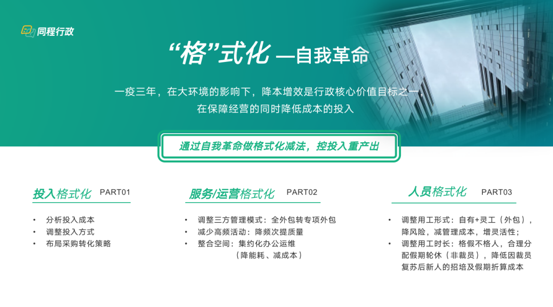 “我们打破了组织的边界。行政从2021年开始把行政服务延伸到综合服务,综合服务是什么?我们把HR一站式人员入、离,IT装机,财务的报税,公共事务对外的一部分对接等等,都整合到自己的一站式服务里。”