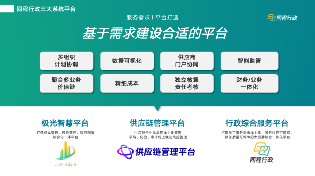 “为了夯实底盘,我们整合打造了三个平台,第一,基于职场维度,比如职场业务布局、职场需求到职场租赁、职场购置,一直到职场运维,职场退出,以这条线为主,我们做了极光平台,和所有HR系统、财务系统,包括服务系统全部打通;第二个平台基于物,比如物资需求,从需求到供应商的引入、供应商评价,到采购订单执行,再到后端的收货入库、出库、物资管理、物资退出,整个链条搭了供应链管理平台。第三个平台是将所有服务类进行整合,比如我们把员工餐食、访客预约等职场服务为主的平台进行了整合,整合之后形成了行政综合服务平台。三大平台支撑有力的支撑了我们的前端业务和前端服务。”