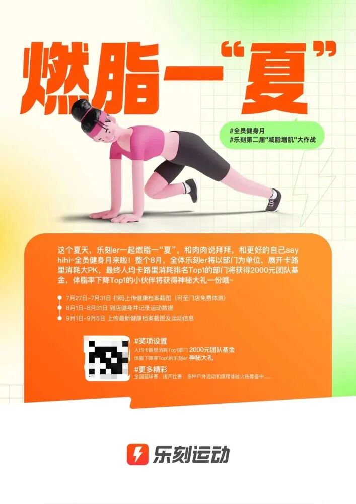 比如,在8月初全员健康月乐刻开启的第二届「增肌减脂」大作战,全体乐刻er将以部门为单位,从拔河比赛到篮球友谊赛展开卡路里消耗大PK……