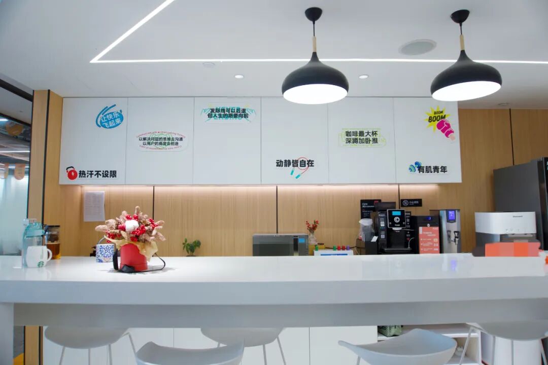 *乐刻运动茶歇区,采用轻快明亮的白色与温馨的木纹色增添整体温馨度,提升员工幸福感