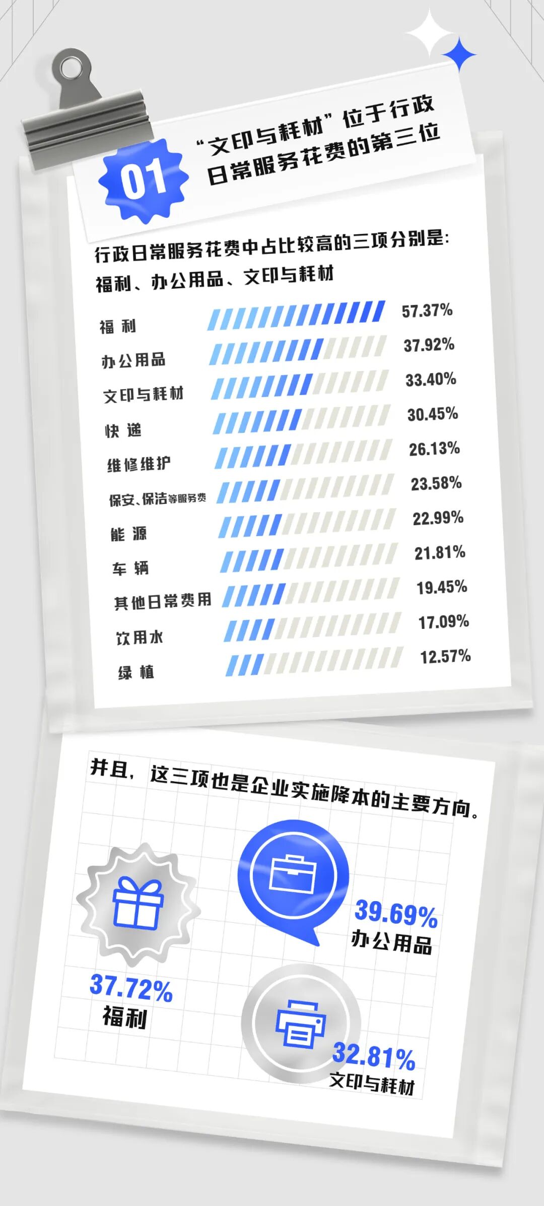 1、文印与耗材在行政日常运营费用的占比并不小,也是目前执行降本的重要一项。解决耗材的浪费问题,是现在最迫切的需要。
