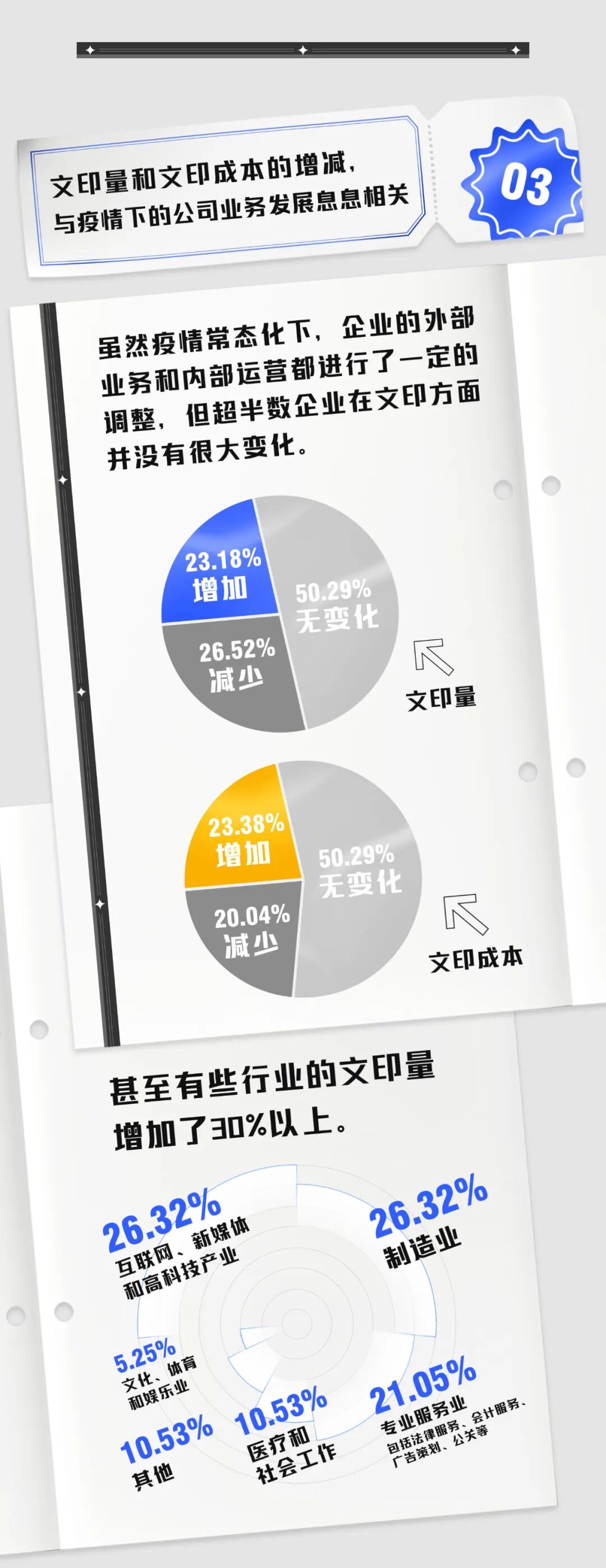 2、超半数的企业表示,公司的文印量和文印成本在疫情前后并无变化,这与公司的业务发展有很大的关联。