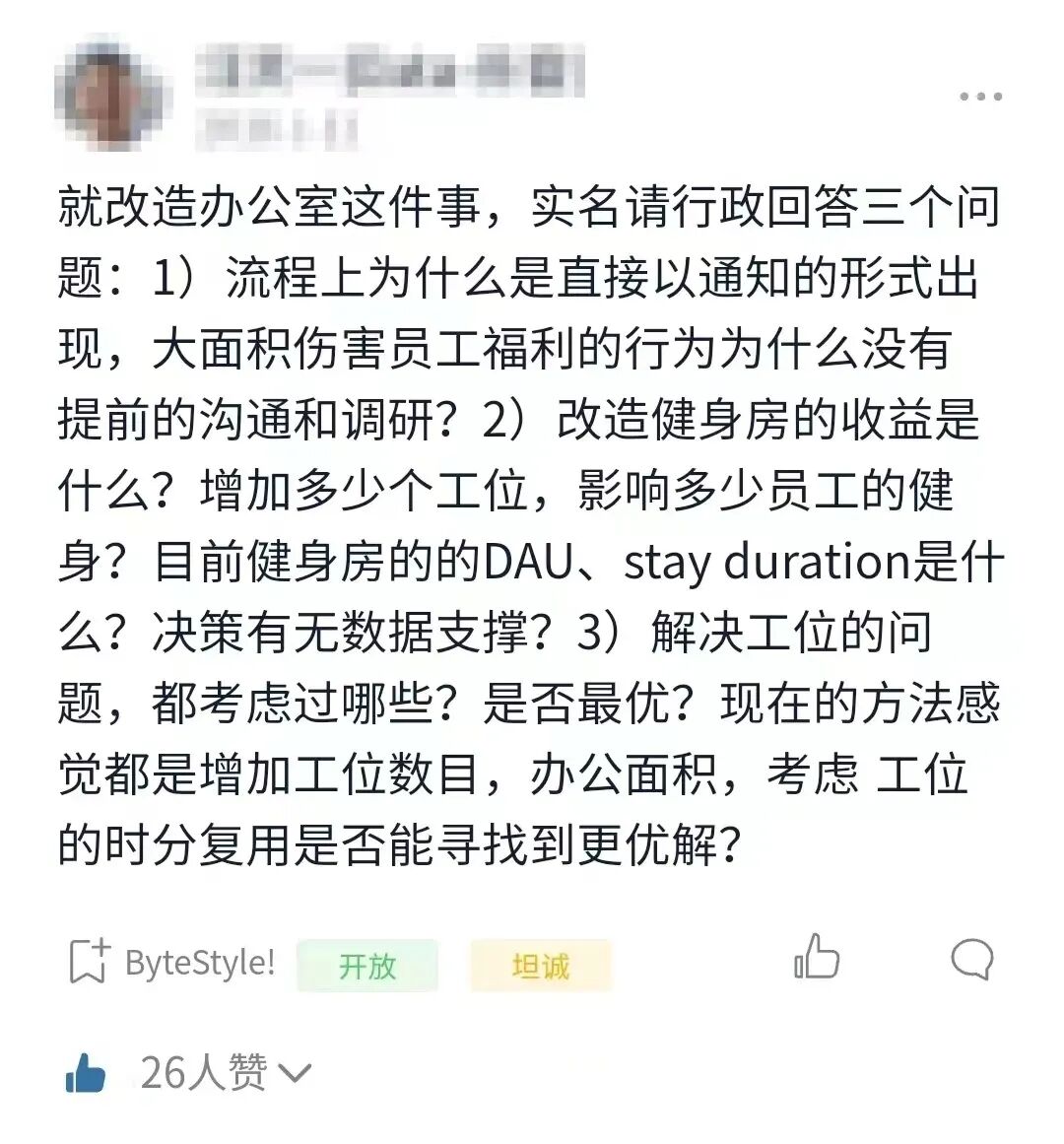 字节跳动在内网中设置了匿名机制,鼓励大家去表达,指出公司有关的问题。