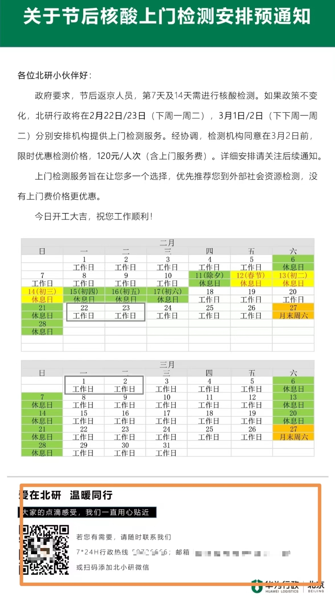 △华为行政北京通知核酸检测安排时预留的沟通通道