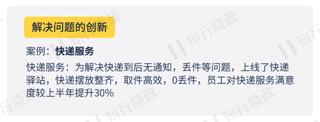 针对解决现有问题的创新方案,在操作时可以从以往的满意度调研入手,首先解决感知度高的事项。在年终汇报时,不但要说明你做了哪些创新,还要说明解决了什么问题、效果如何,投入成本有多少。