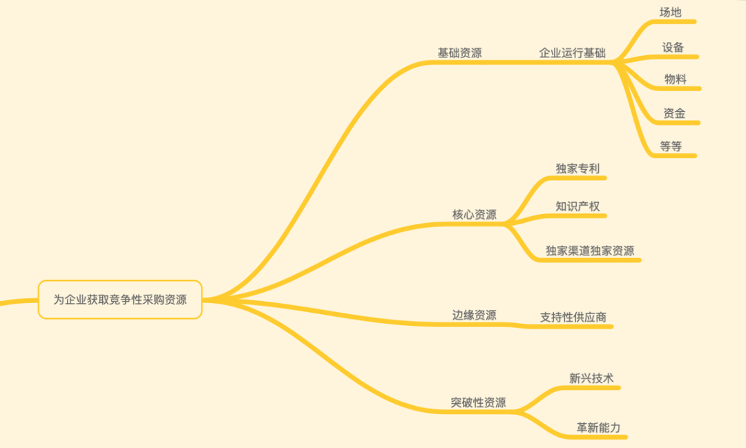 1. 基础资源:基础资源是企业运行的基础,包括但不限于场地、设备、物料、资金等等,采购在基础资源的布局往往需要放在很长期的一个时间范围内才能看见效果,采购需要具备足够的前瞻性眼光与预判能力,比如:基础资源中的企业地产早期购买,未来随着国家的发展与进步,投资回报率甚至超越企业业务,逐渐转变为企业核心资源。