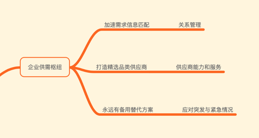 加速匹配是枢纽的核心价值,需求信息的识别、筛选、匹配、速度、误差如果是人工操作,就是采购人日常工作的效率,如果是系统计算识别,就是数字化采购的亮点提效所在。加速需求信息匹配,内部关系管理非常重要,获得、建立、维系、巩固、发展企业在采购流程中诸方关系的落地方式包括但不限于:深度沟通与明确需求关键点、日常财务、法务协作关系维护、跨部门团建等等。
