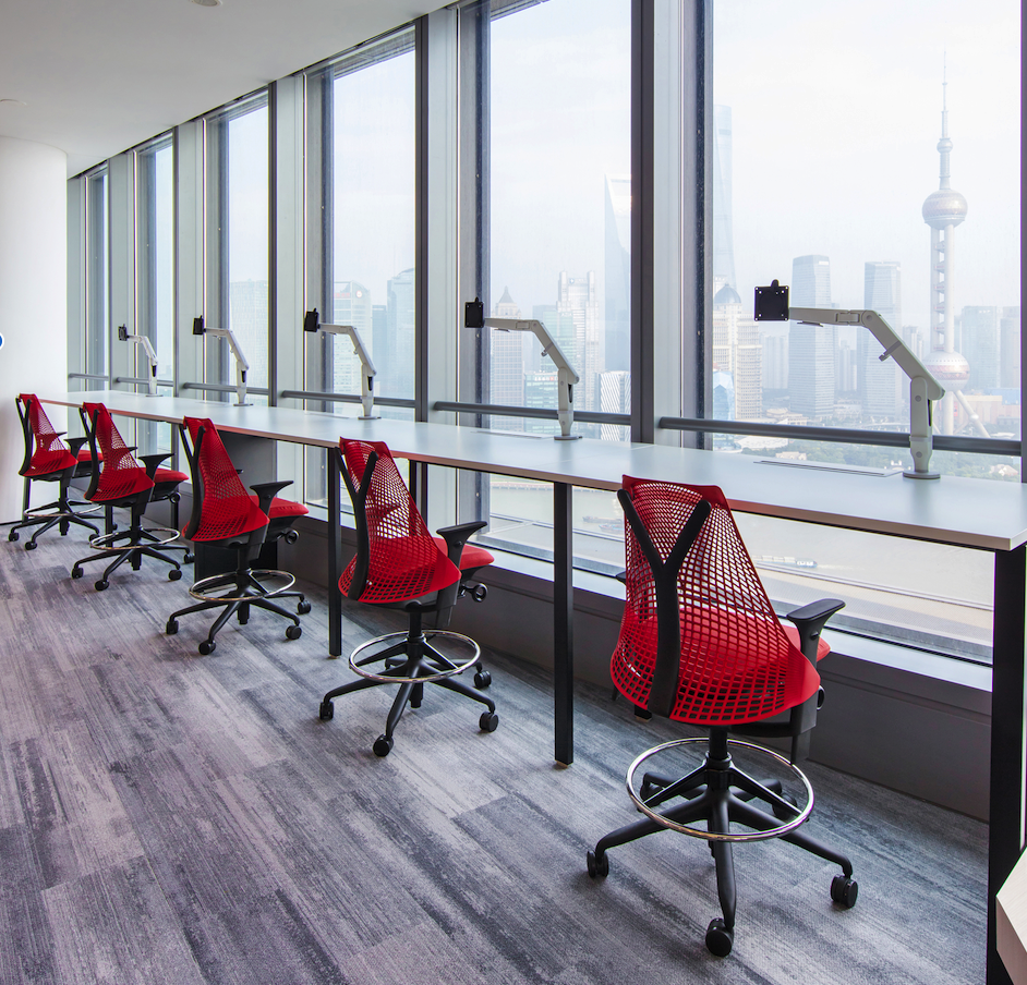 另外,升降桌+人体工学椅是打造健康空间的绝佳手段~ 还有很多公司会用不同高低组合的桌椅打造一片灵活办公区,健康指数也不低哦~