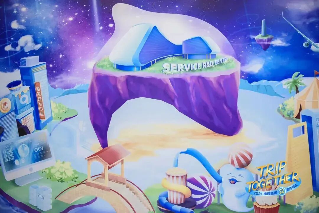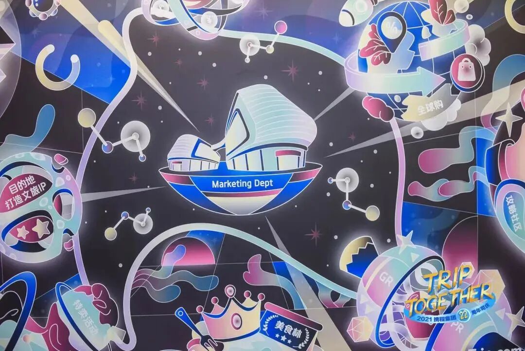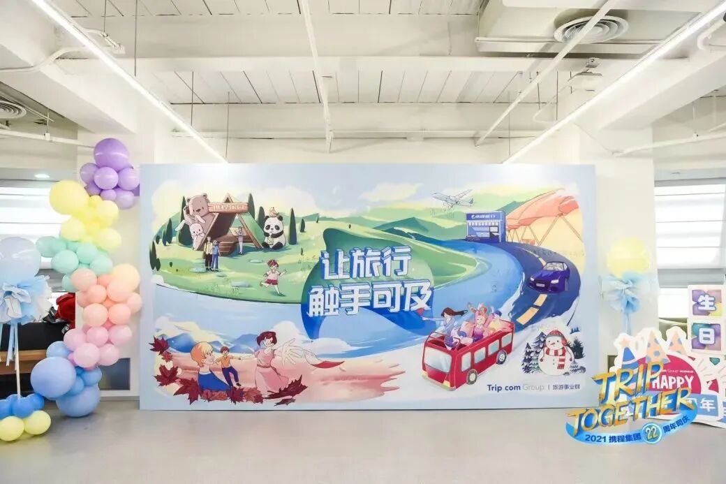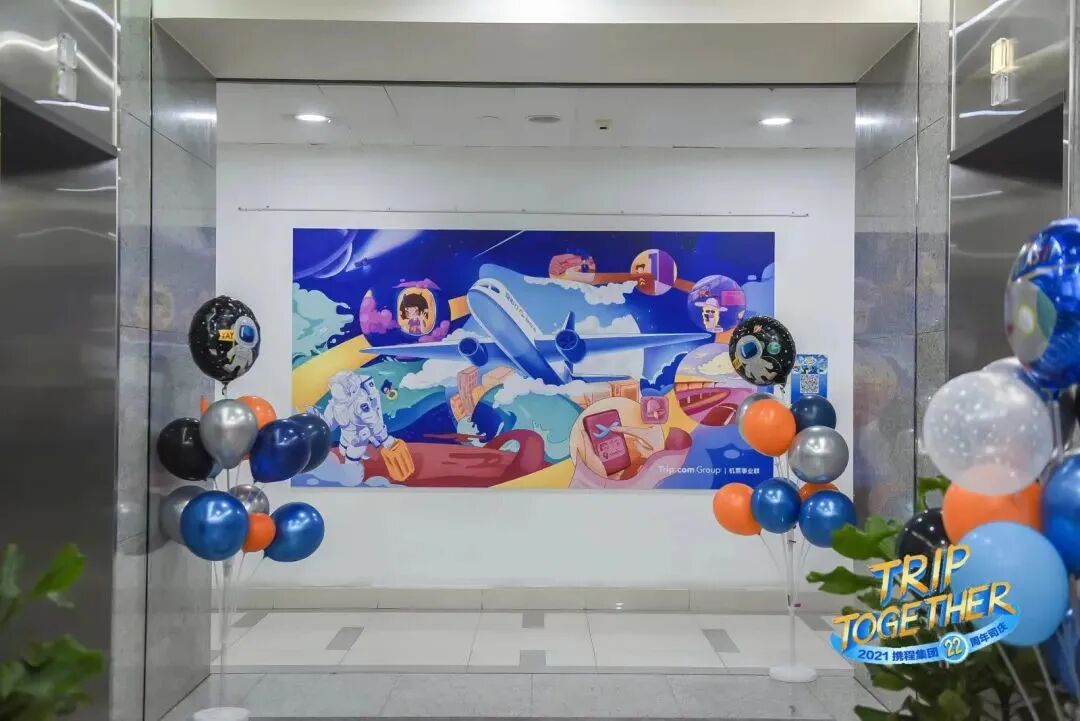 携程22周年庆典第一天由携程各业务部门举行“业务愿景墙”揭幕仪式,揭幕仪式中的13幅画面是由几百名程里人历时两个月,经过一次次共创、一笔笔设计而成,是庆祝,也是留下回忆。