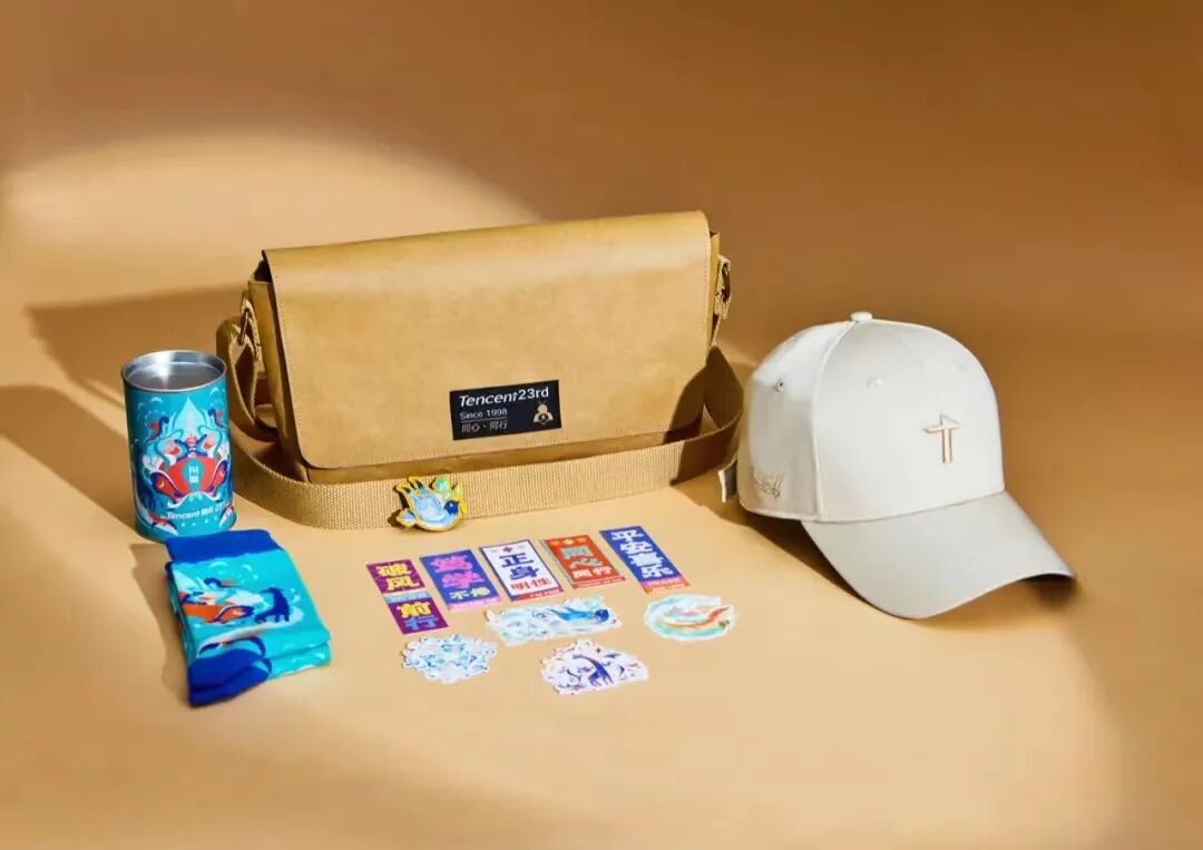 腾讯23周年礼品是刺绣休闲棒球帽、可湿牛皮纸斜挎包、刺绣徽章、撞色贴纸、敦煌针织袜,加文化衫盲盒。