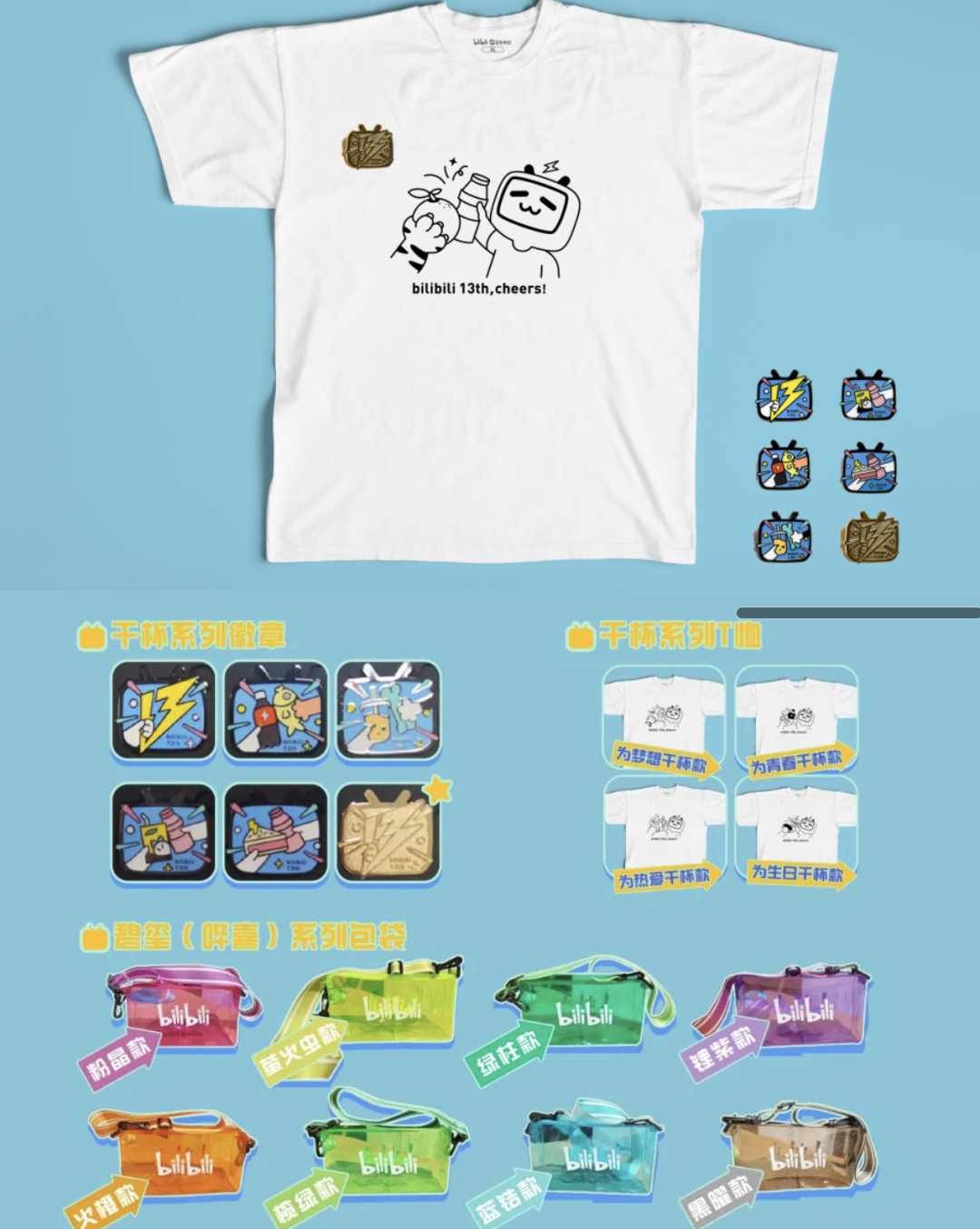 B站13周年为员工设计了一套“寻宝装备”,由4款干杯系列T恤,6款干杯系列徽章和8款碧玺(哔喜)系列包袋组成,其中,还隐藏着626枚金色隐藏款徽章!全部以盲盒的形式派发,激起了全员收集癖。